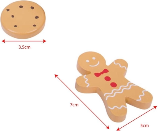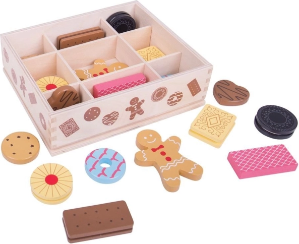 Wir präsentieren die Holzkiste mit Keks-Spielzeug, die eine Auswahl an beliebten Keksen, darunter Lebkuchen und weitere Köstlichkeiten, enthält. Dieses Set ermöglicht es kleinen Kindern, durch backinspirierte Spiele ihre Kreativität zu entwickeln.