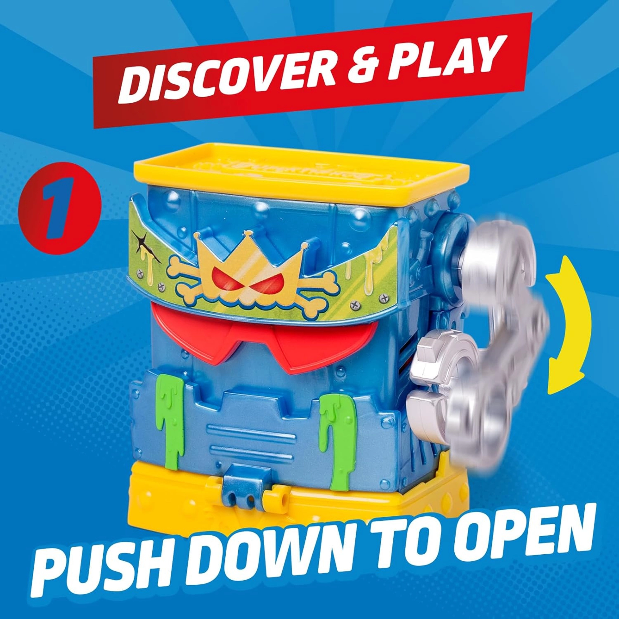 Überliste die Verteidigungsmechanismen, sammle wertvolle Kazoom-Energiekapseln und werde zum Helden von Kaboom City. Die Geheimbasis von MR KING ist voller Überraschungen – dreh- und verschiebbare Paneele, falsche Türen und clevere Fallen testen deine Schnelligkeit und deinen Einfallsreichtum. Das Set ist ideal für das Solospiel oder den Wettkampf zu zweit.