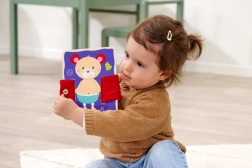 Jede Tafel präsentiert einen anderen Verschlusstyp – Kinder üben Reißverschluss, Druckknöpfe, Schnallen, Knöpfe sowie Schnüren und gewinnen Sicherheit beim Anziehen.