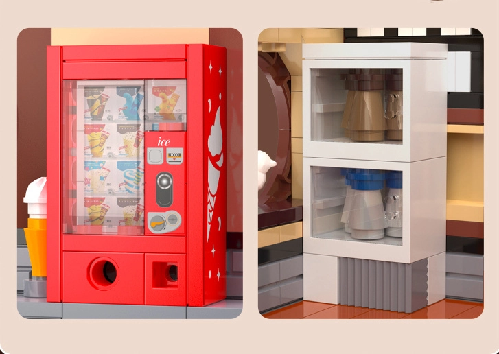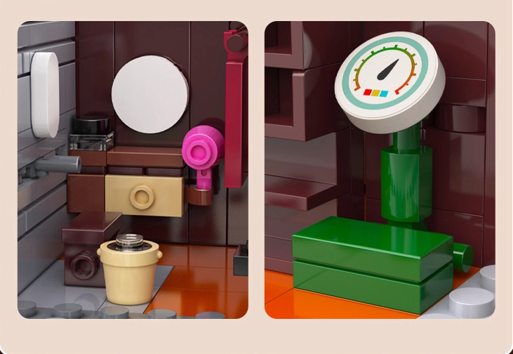 Der Innenraum umfasst eine Rezeption, eine Umkleide und einen Bereich mit heißen Bädern. Bänke, Handtücher und kleine Dekorationen verstärken die Atmosphäre. Die integrierte LED-Beleuchtung mit verschiedenen Effekten verleiht dem Bau Leben und macht ihn zu einer auffälligen Dekoration für jedes Regal oder jede Vitrine.