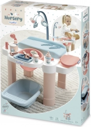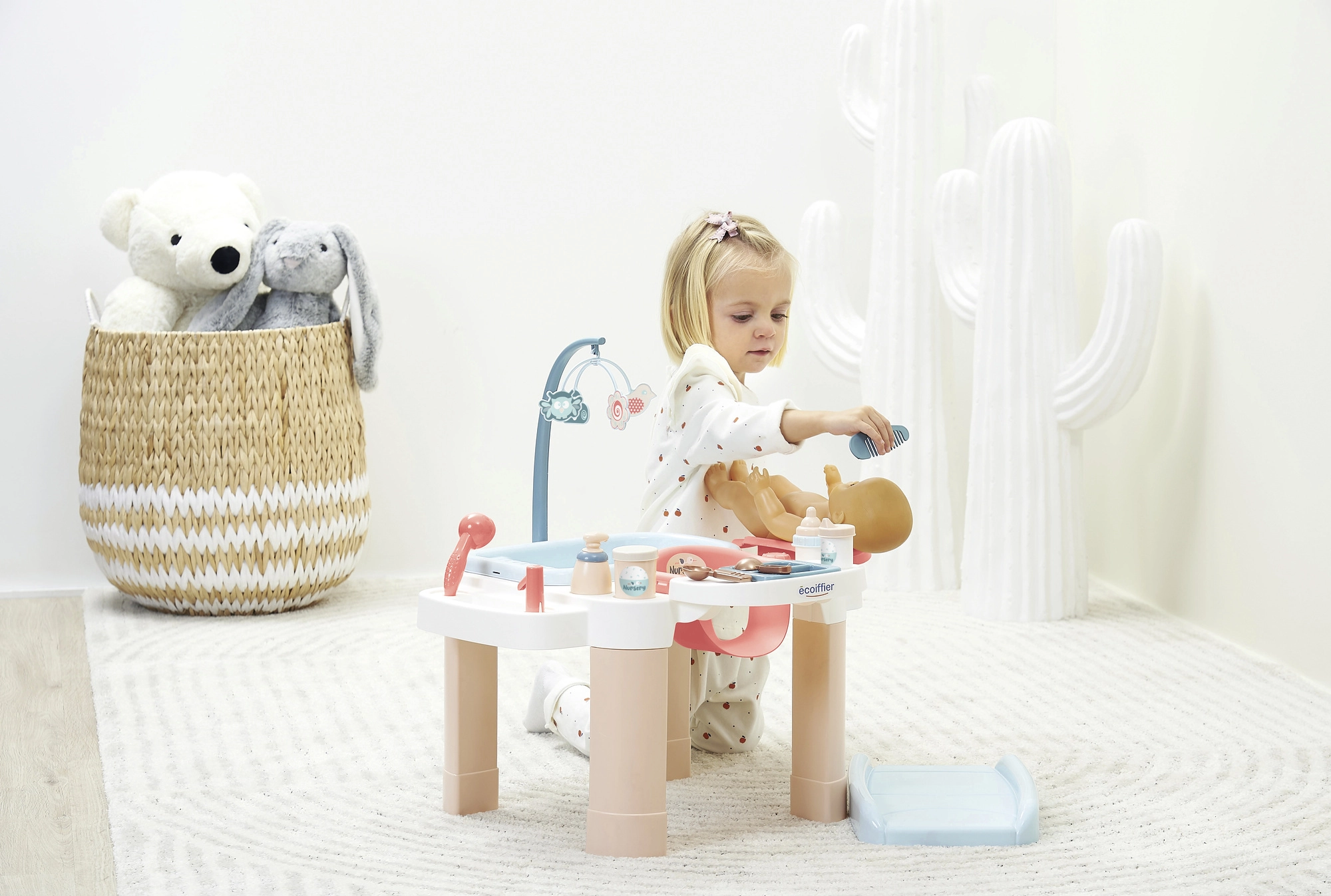 Der Tisch in zarten Pastelltönen ist ideal fürs Kinderzimmer. Das Badewännchen mit Ausguss, Organizer für Fläschchen und Utensilien sowie der klappbare Deckel der Wickelfläche sorgen für Übersicht und Ordnung. 13 Zubehörteile (Fläschchen, Löffel, Döschen u. a.) machen das Spiel spannend und realistisch.