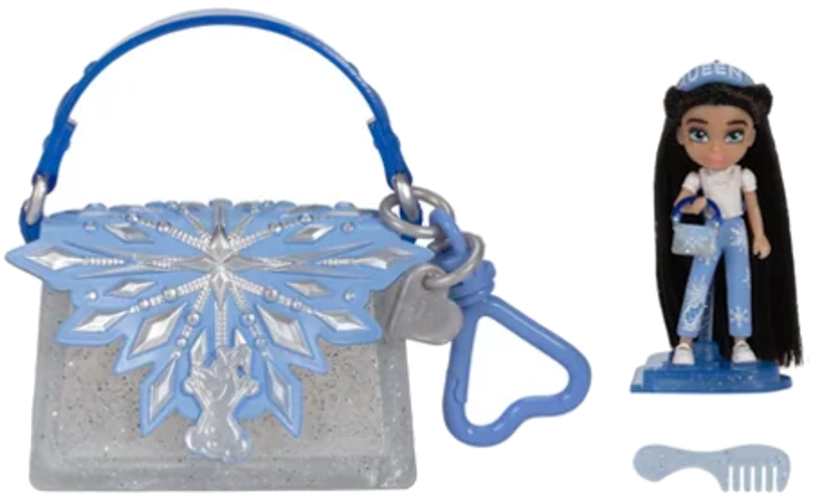 Diese modische Mini-Puppe aus der Kollektion Disney ILY 4Ever Tote Teenies verbindet die Welt der Mode mit Fantasie. Sie hat lange dunkle Haare, trägt ein blau-weißes Outfit mit Schneeflockenmotiv und wird durch sportliche Schuhe sowie eine Mini-Handtasche mit Schneeflocke ergänzt. Ideal für kleine Fans der Disney-Welt und Sammler.