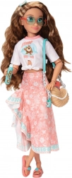 Das Outfit in rosa und türkisfarbenen Tönen mit ozeanischem Print wird durch Sonnenbrille, Umhängetasche, Getränk, Haarreif und Smartphone ergänzt. Abnehmbare Kleidung und Schuhe ermöglichen einfaches Umstylen, während die robuste Konstruktion lange Haltbarkeit und sicheres Spielen gewährleistet.