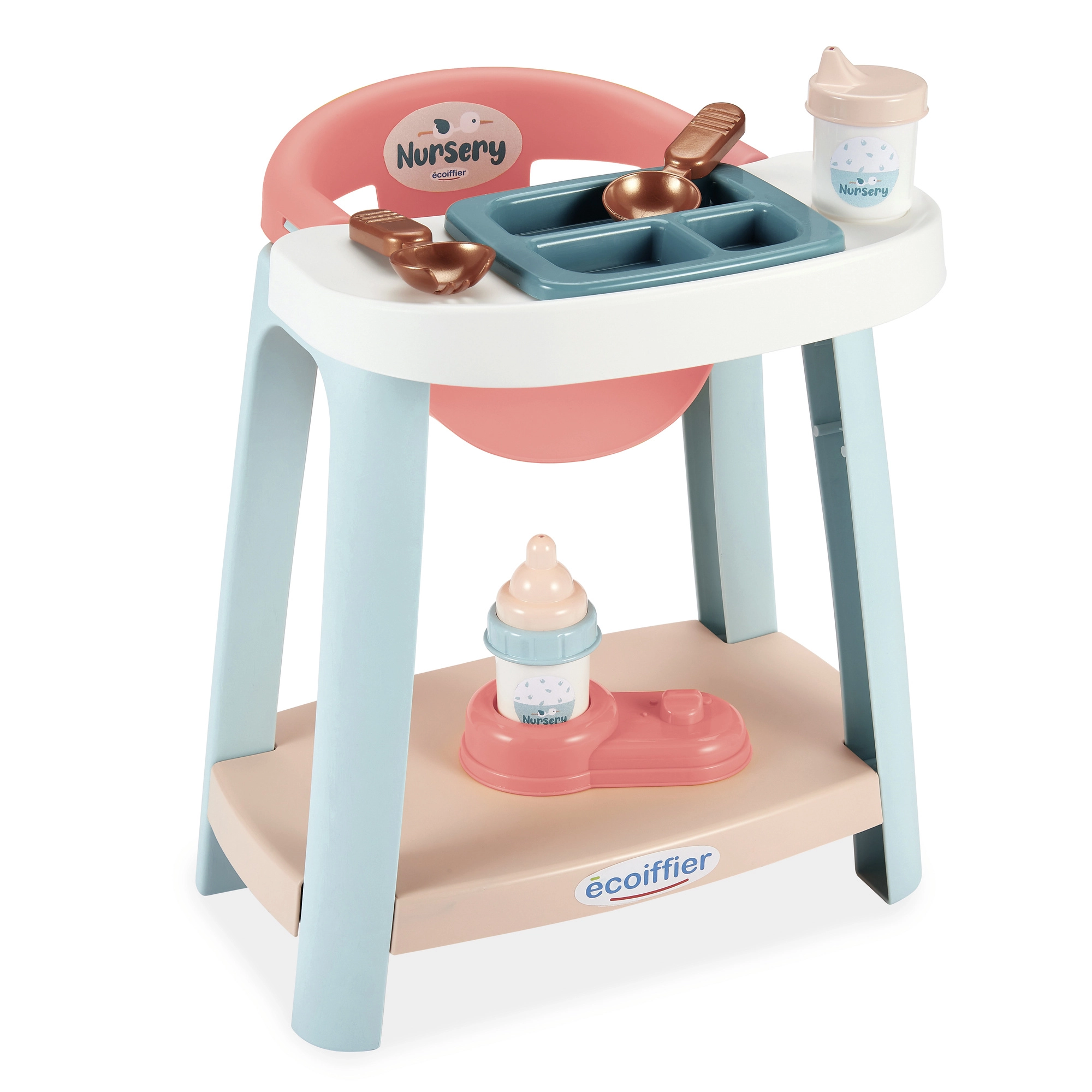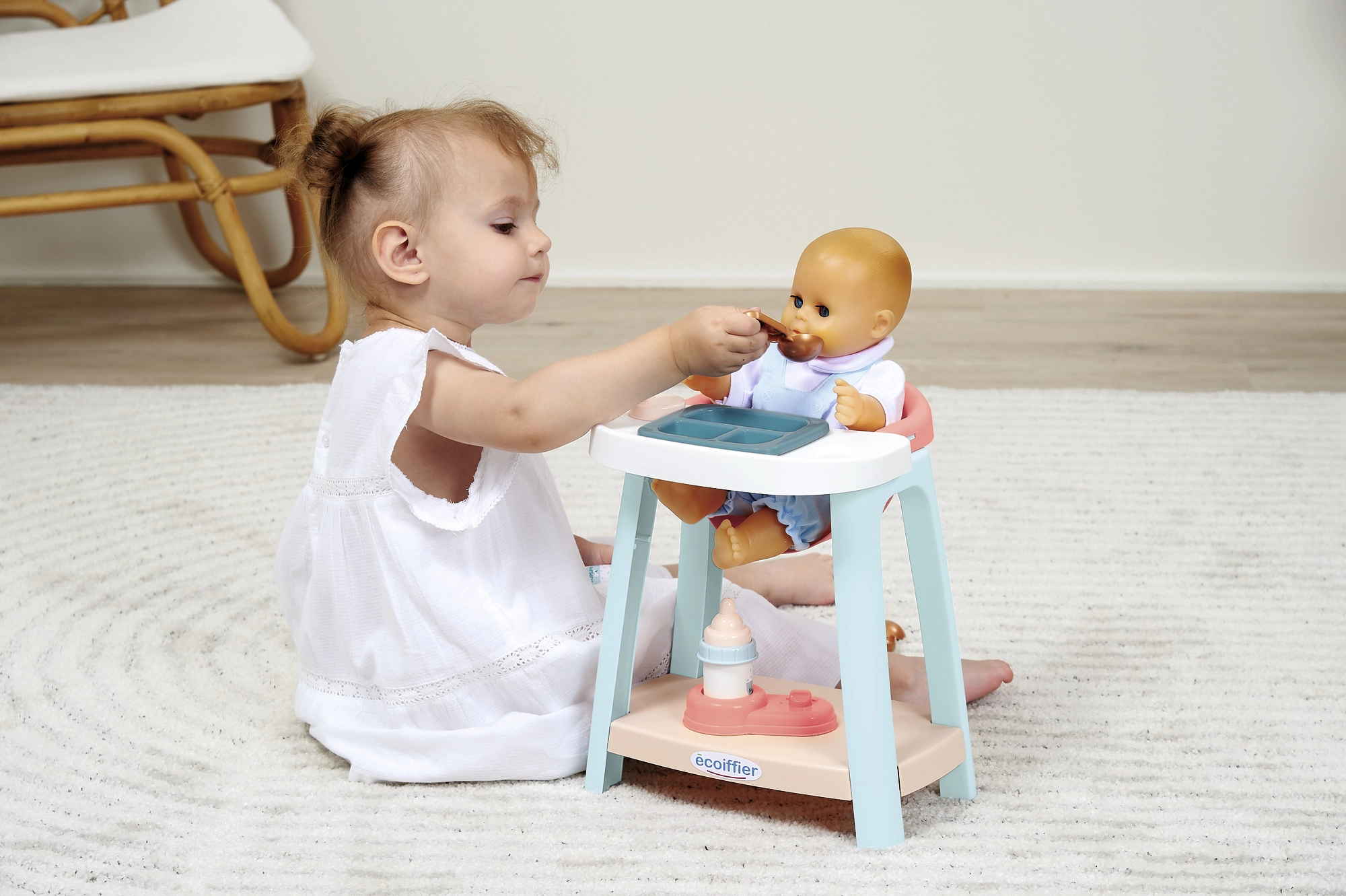 Ein stabiler Hochstuhl mit Tablett ermöglicht es Kindern, die Puppe bequem zu „füttern“ und echte Essensrituale nachzuahmen.