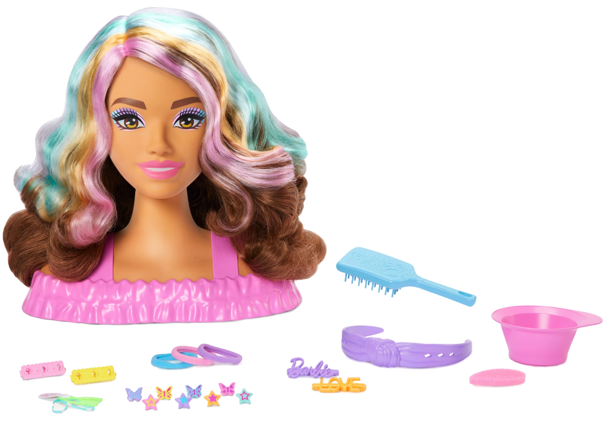 Der BARBIE Frisierkopf bietet Kindern endlose Möglichkeiten zum Frisurengestalten. Lange braune Haare mit rosa, orangefarbenen und türkisfarbenen Strähnen halten die Form gut und laden zum Flechten, Stecken und Verzieren ein. Für zusätzlichen Spaß sorgen Spangen und Lippen mit Farbwechsel bei Verwendung von Wasser und Schwämmchen.