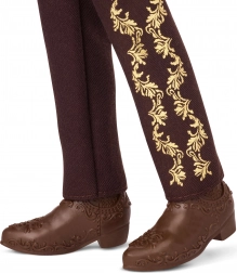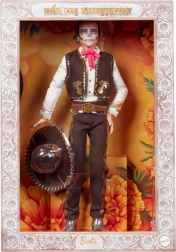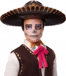 Diese einzigartige Sammler-Puppe bringt die authentische Atmosphäre der mexikanischen Día de Muertos-Feiern zum Ausdruck. Ken trägt ein verziertes Gesicht im Calavera-Stil, ein weißes Hemd mit Blumenstickerei, eine braune Weste und eine Hose mit goldenen Ornamenten, einen Gürtel und einen breiten Sombrero. Dank der sorgfältigen Ausführung wirkt er wie ein echter Mariachi.