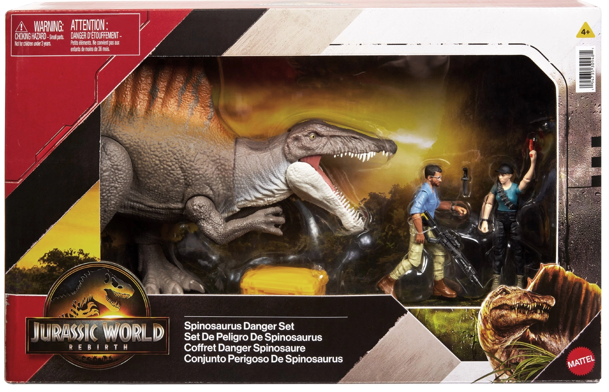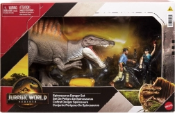 Dieses Set von Mattel bietet einen realistisch gestalteten Spinosaurus mit markantem Rückensegel, öffnendem Maul und beweglichen Gelenken. Zwei Menschenfiguren mit Zubehör – Waffen, Werkzeugen und einer gelben Transportkiste – erweitern die Spielmöglichkeiten und ermöglichen spannende Verfolgungsszenen sowie Rettungsmissionen.