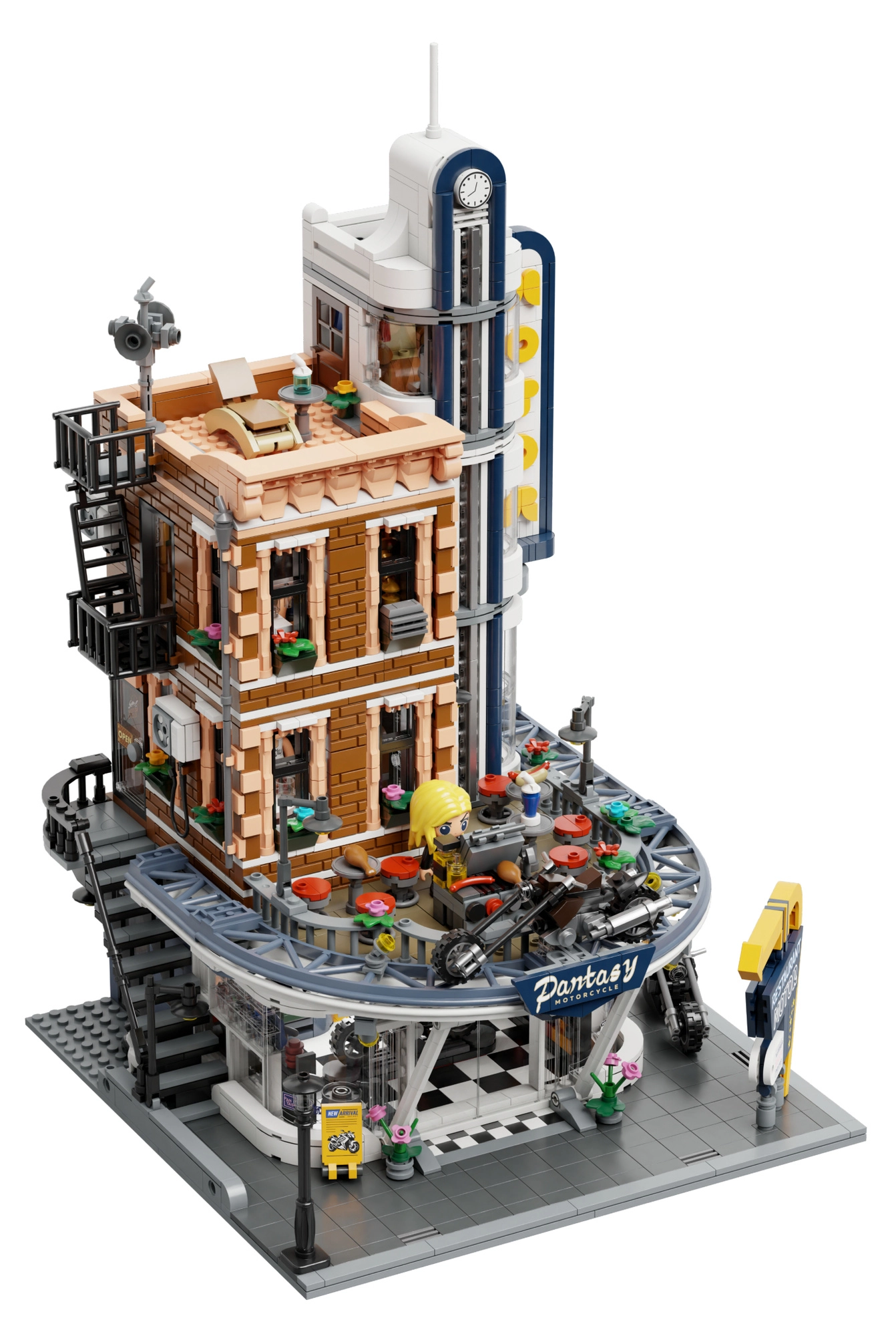 Eckrestaurant mit Motorradladen, Minifiguren und Straßenzubehör bietet zahlreiche Szenarien für Spiel und Display.