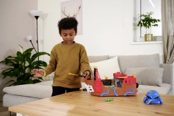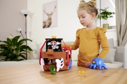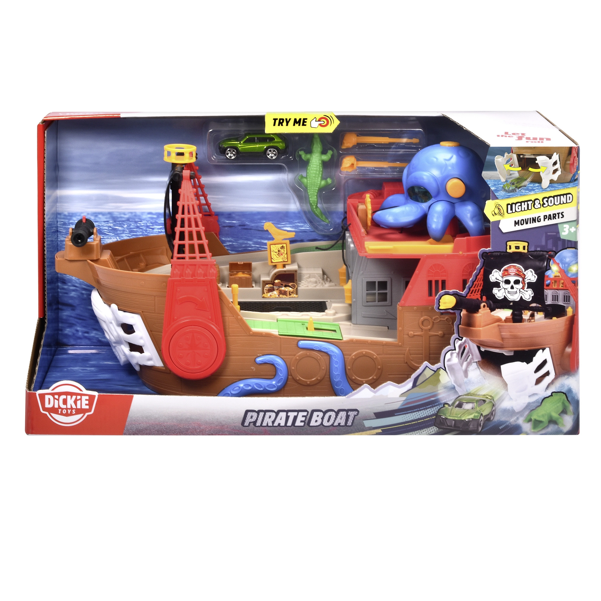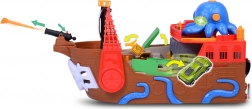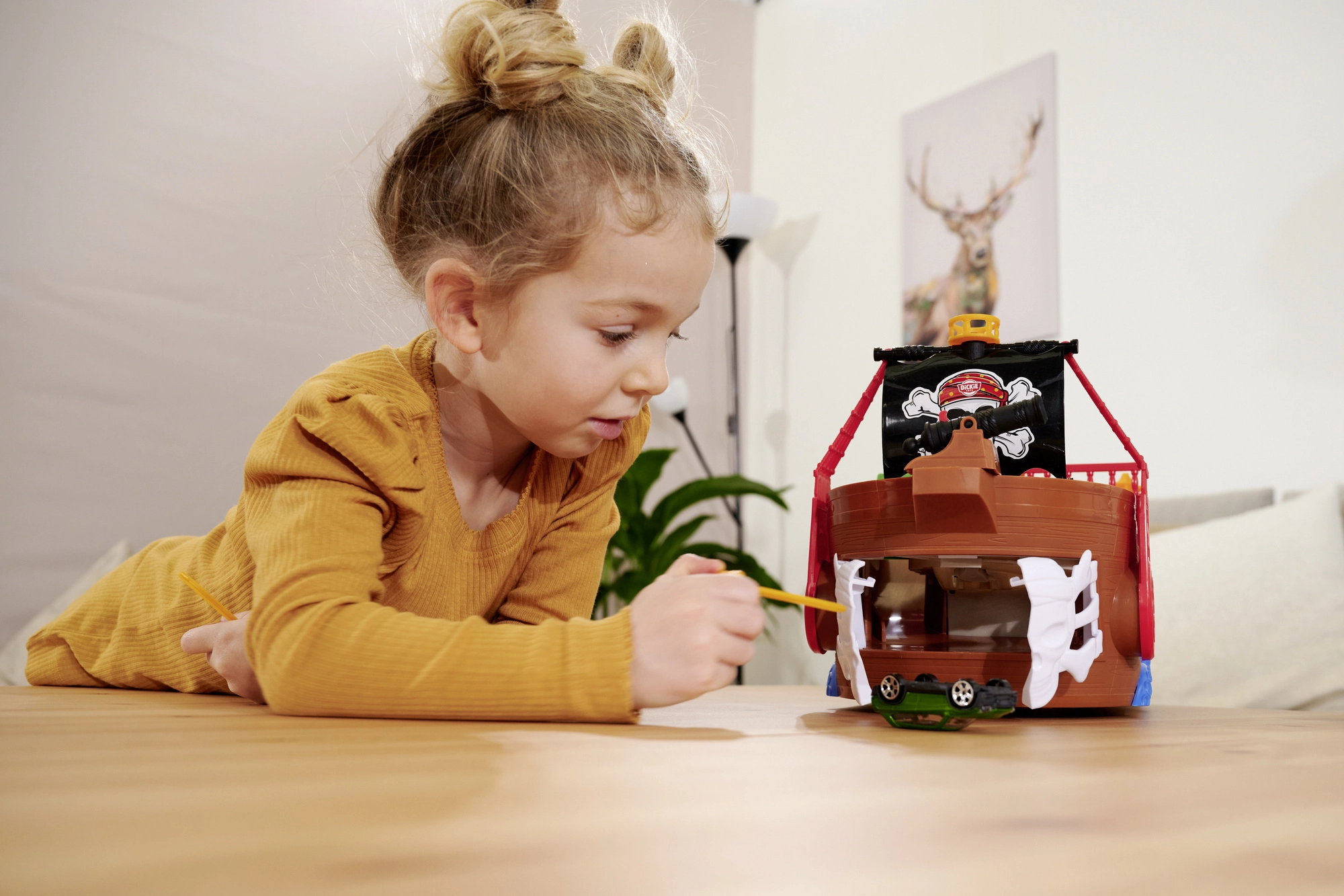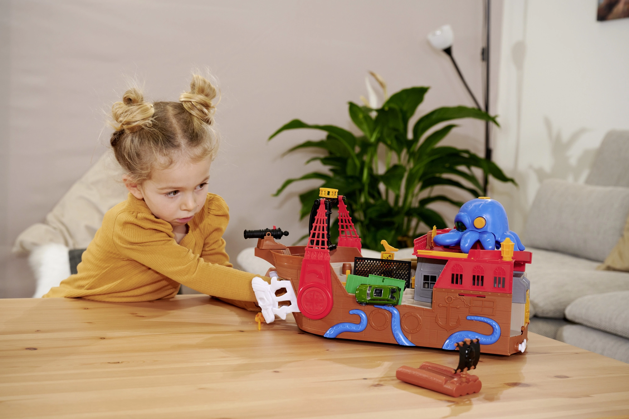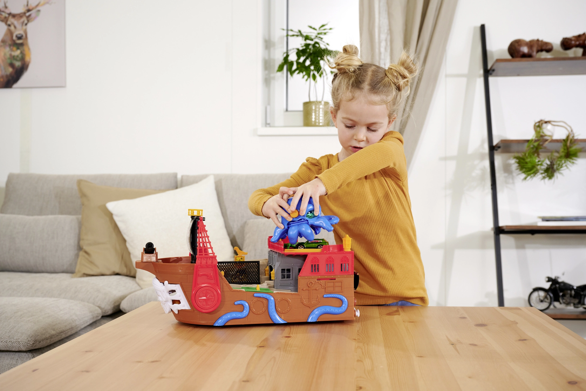 Die abnehmbare Krake mit Licht- und Soundeffekten lässt die Augen leuchten und „schnappt“ sich mit ihren Tentakeln das Auto oder andere Teile – perfekt für dramatische Piratengeschichten. Schiff und Floß bleiben auf dem Wasser, ideal für Badewanne, Pool oder Planschbecken. Nach dem Baden geht die Action dank interaktiver Funktionen und der geschmeidigen Fahrt des Autos auf dem Teppich weiter.