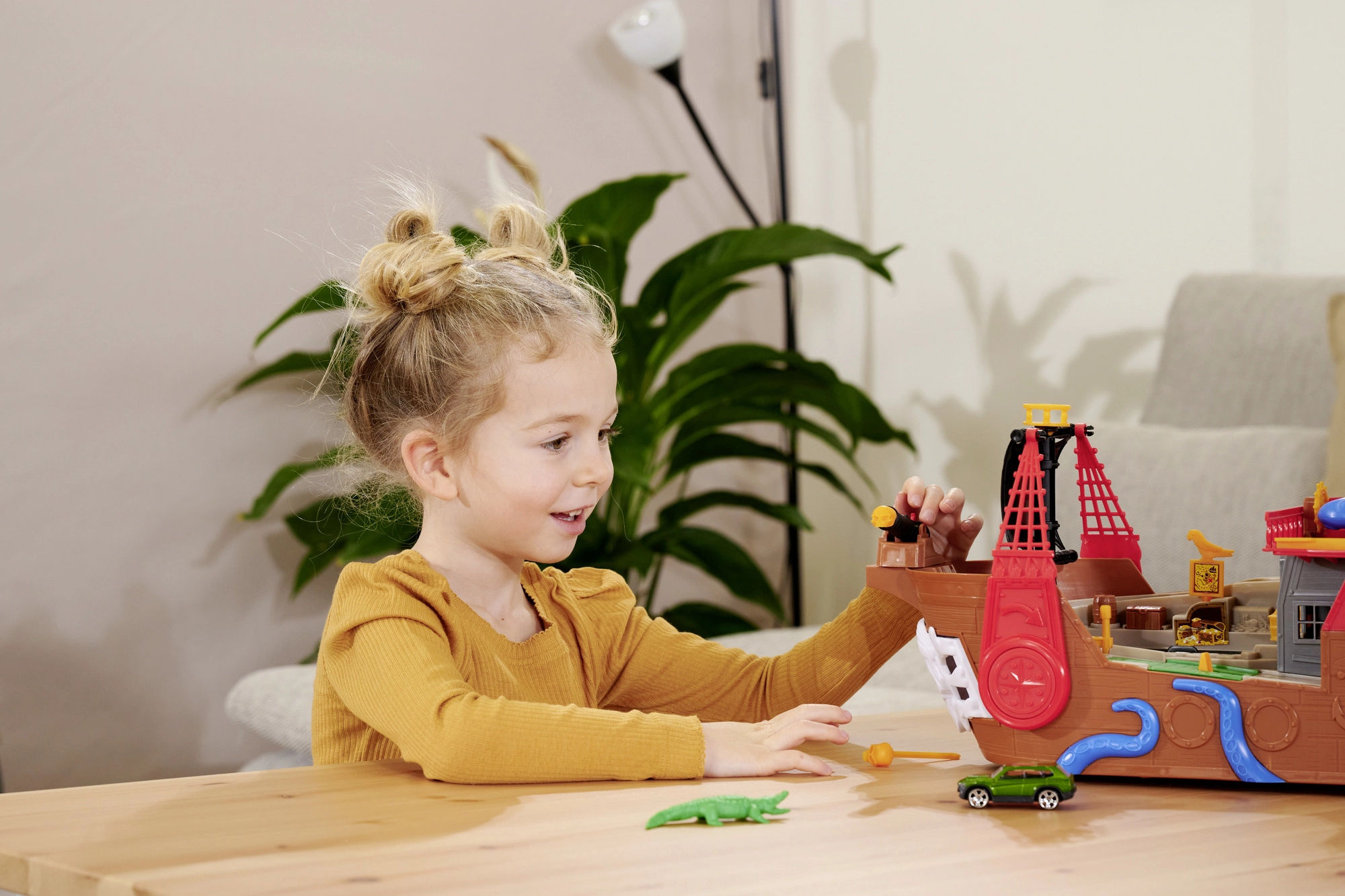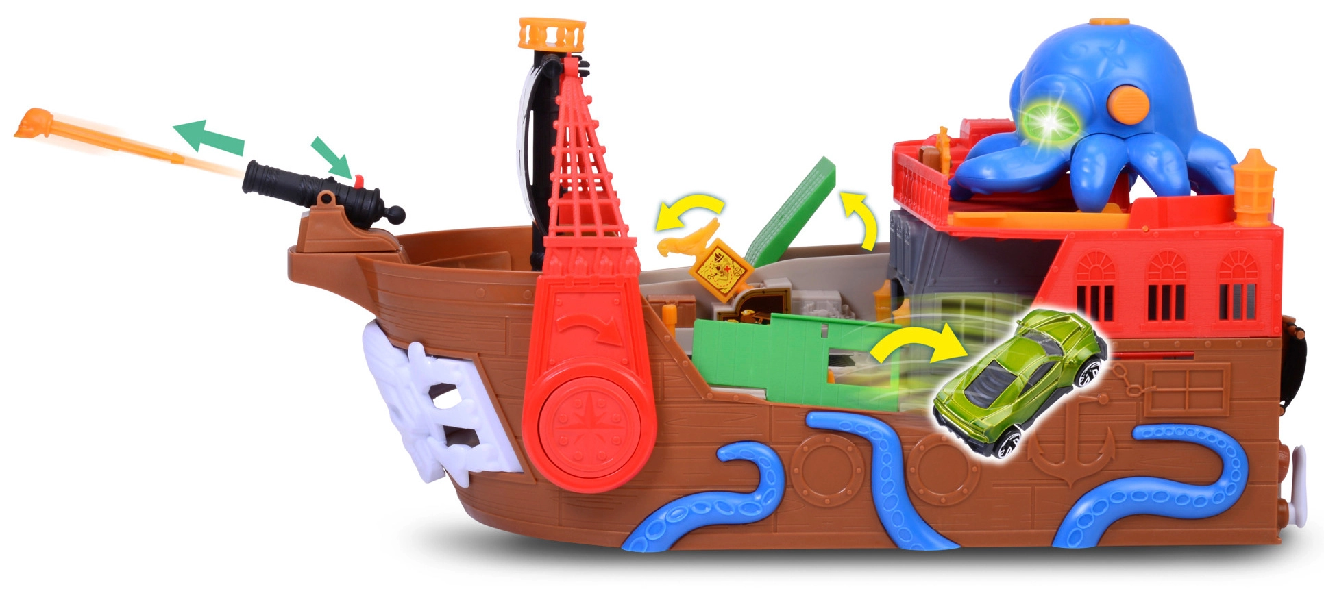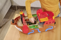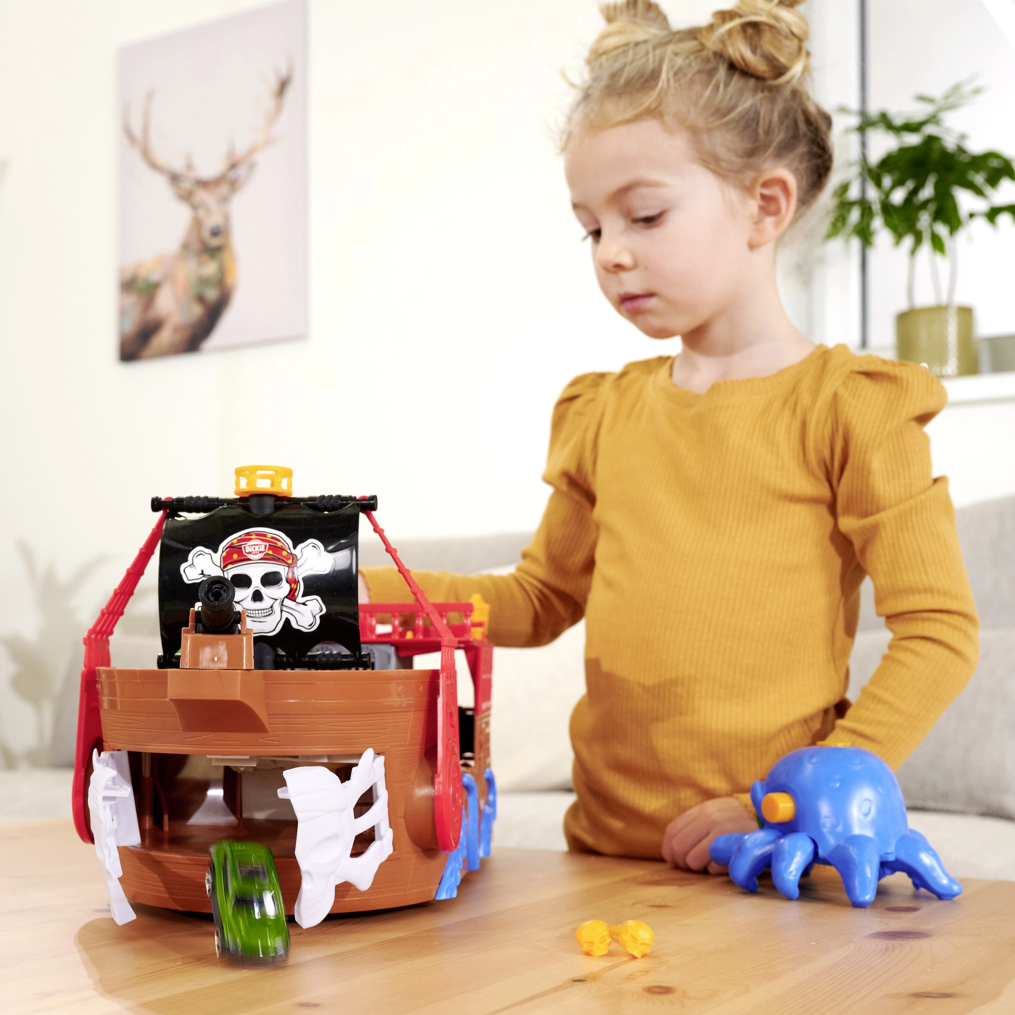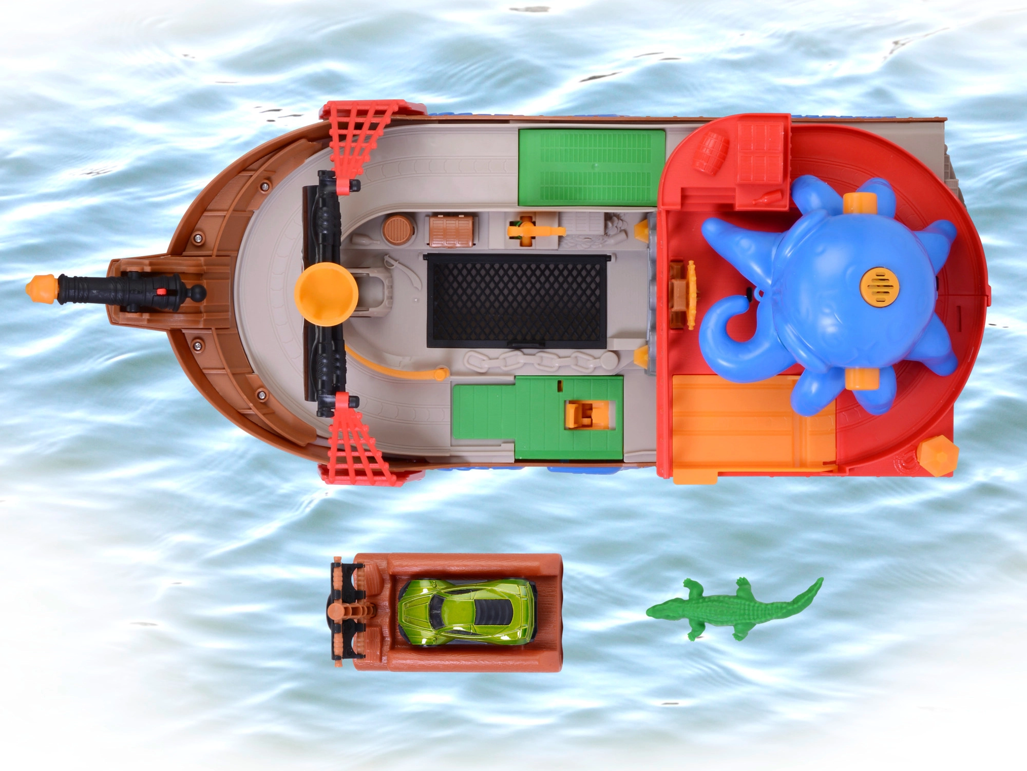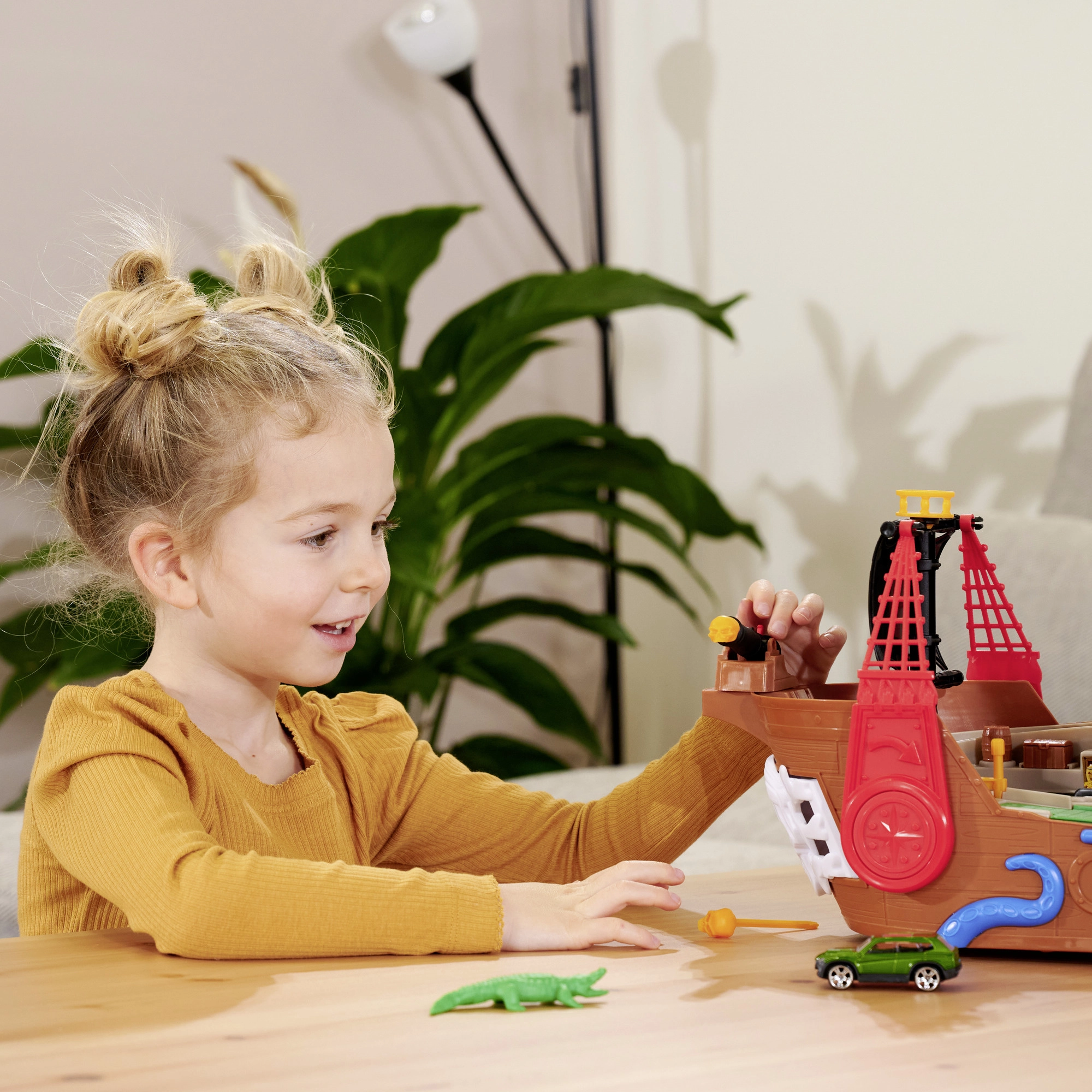 Dieses detailreich gestaltete Piratenschiff ist ein echtes Spaßzentrum. Hebt ihr das Deck an, erscheint eine eingebaute Bahn für das Metallauto, auf der ihr mithilfe von Hebeln und Schaltern bestimmt, ob das Fahrzeug durch das Skeletttor schießt, im Gefängnis landet oder vom Floß katapultiert wird. Mit dabei sind funktionsfähige Kanone, Schatztruhe, Fässer, Krokodil und weiteres Zubehör, das die Fantasie anregt.