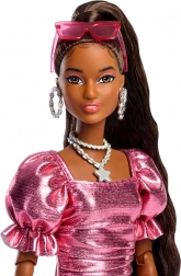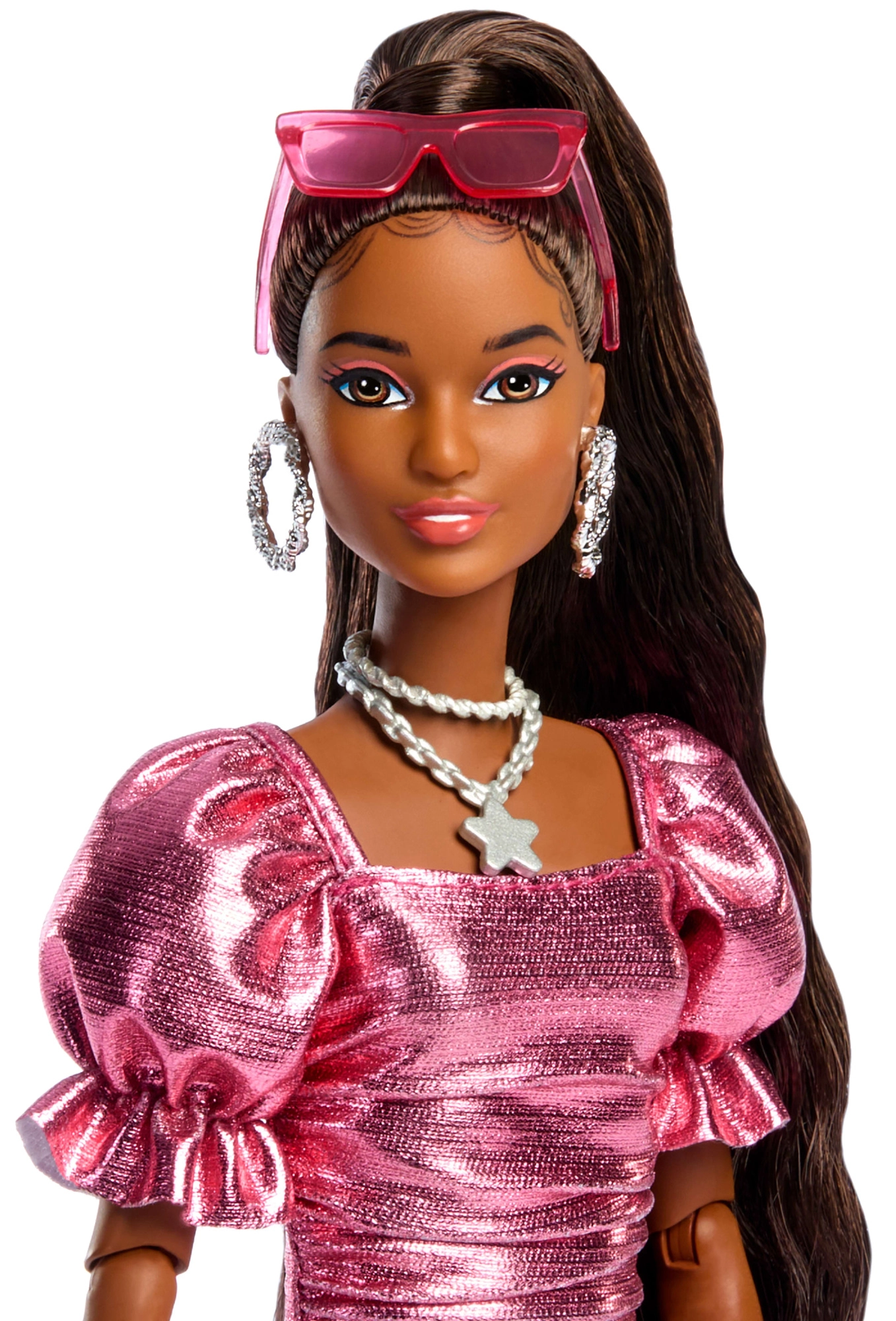 Die BARBIE Deluxe Style Puppe überzeugt mit modernem Look und hochwertigen Materialien. Das glänzende, korallenfarbene Kleid mit voluminösem Unterteil, die rosa Brille, Kreolen, die Layering-Halskette und die elegante Handtasche bilden ein perfektes Outfit für den Laufsteg wie auch für Alltagsgeschichten. Langes dunkles Haar im hohen Pferdeschwanz unterstreicht den trendigen Look.