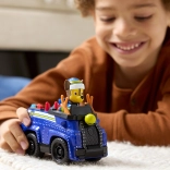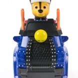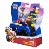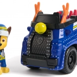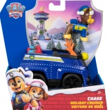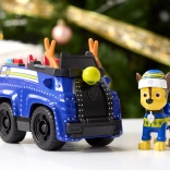 Detailreiches blaues Fahrzeug mit weihnachtlichen Elementen und beweglichen Rädern. Die CHASE-Figur mit Wintermütze sitzt direkt im Cockpit und ist einsatzbereit.