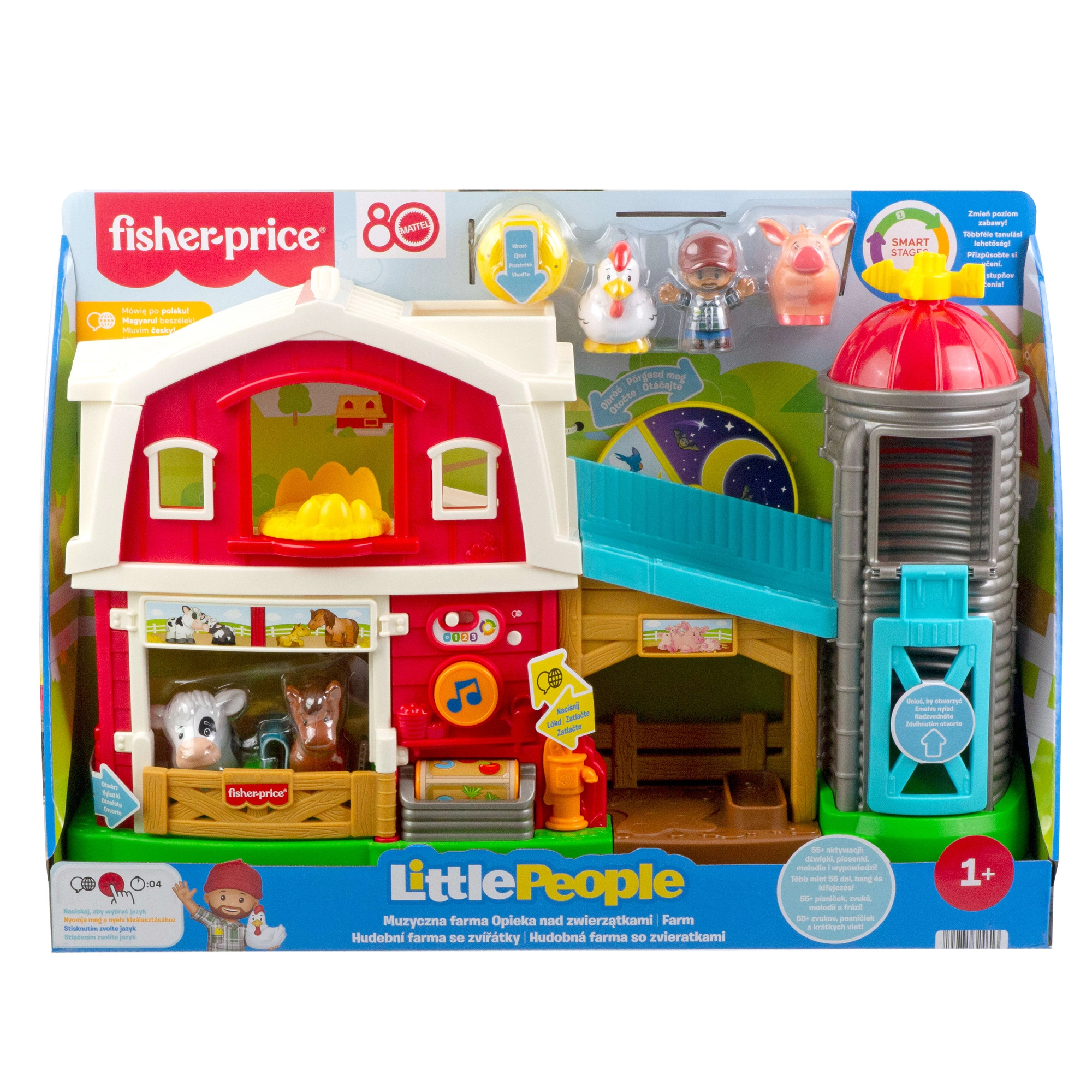 Die mehrsprachige Wiedergabe (CZ/PL/HU/SK/EN) wird bequem über die Globus-Taste gewählt. Mehr als 55 Geräusche und Sätze vermitteln Farben, Zählen, Gegensätze und Fürsorge. Enthalten sind eine Bauernfigur, vier Tiere (Kuh, Pferd, Schaf und Ferkel) sowie ein Heuballen – alles in einem freundlichen Design mit warmen Farben.