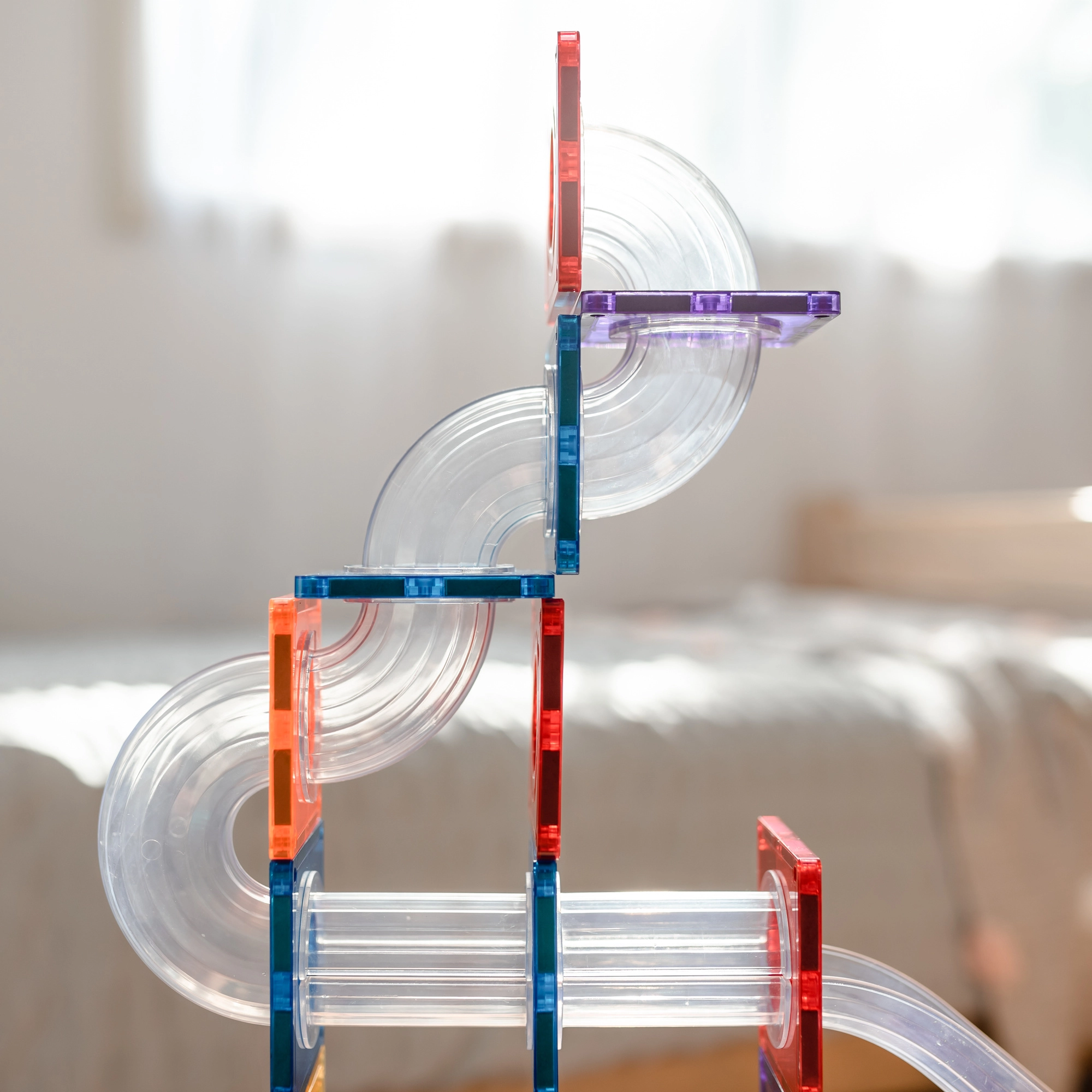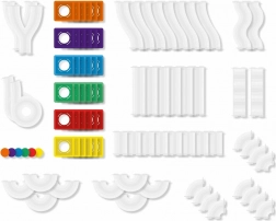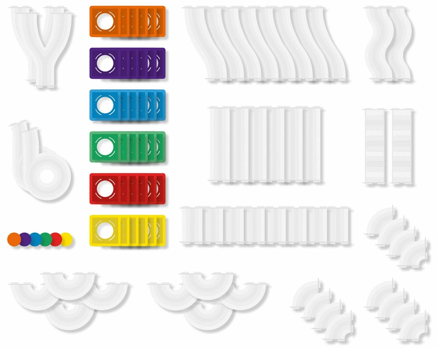 Klare Röhren, Kurven, S-Formen und Y-Verteiler ermöglichen es, die Bewegung der Kugeln zu verfolgen und Geschwindigkeit, Gravitation sowie Ursache und Wirkung in verschiedenen Aufbauten zu erforschen.