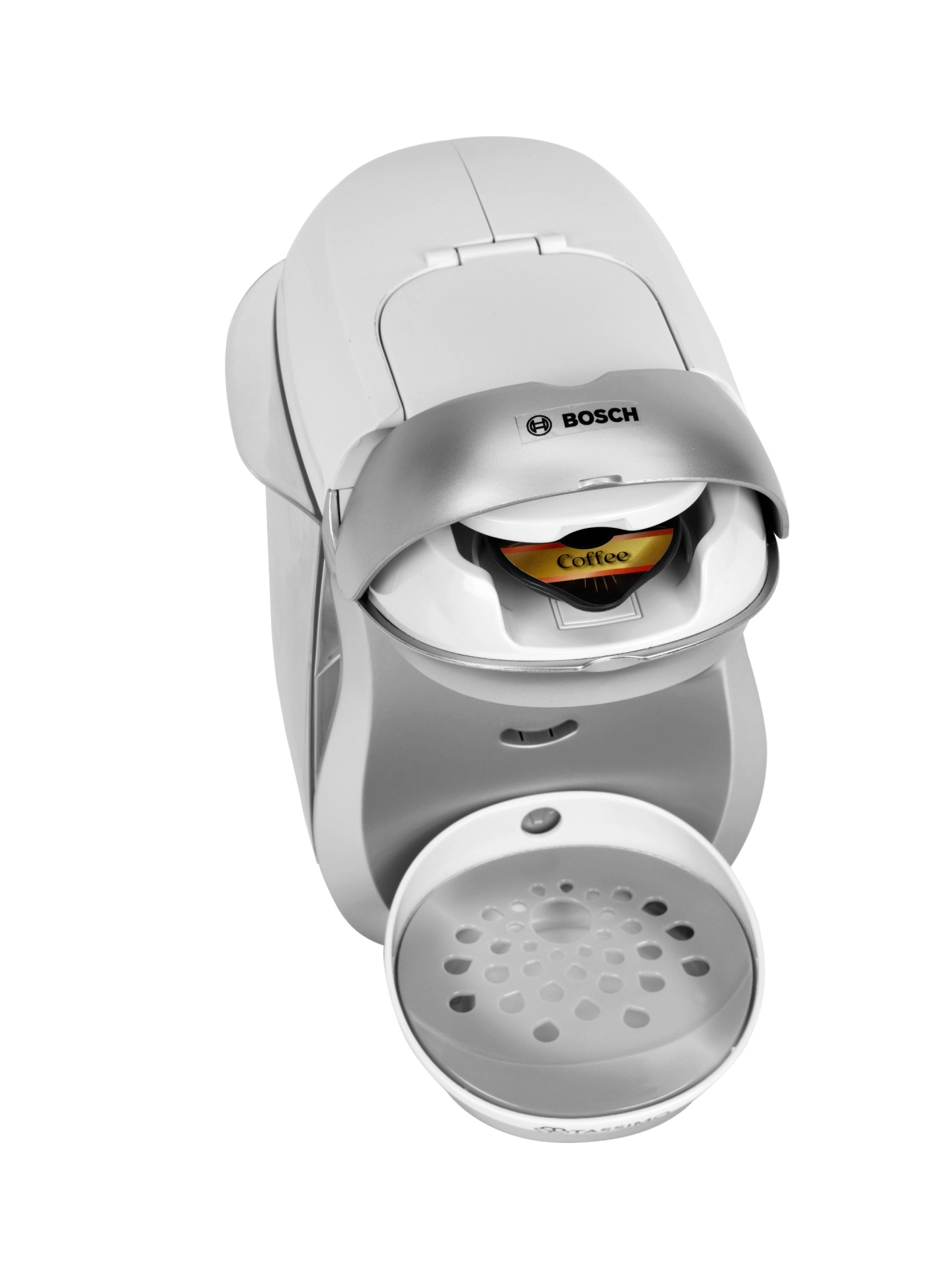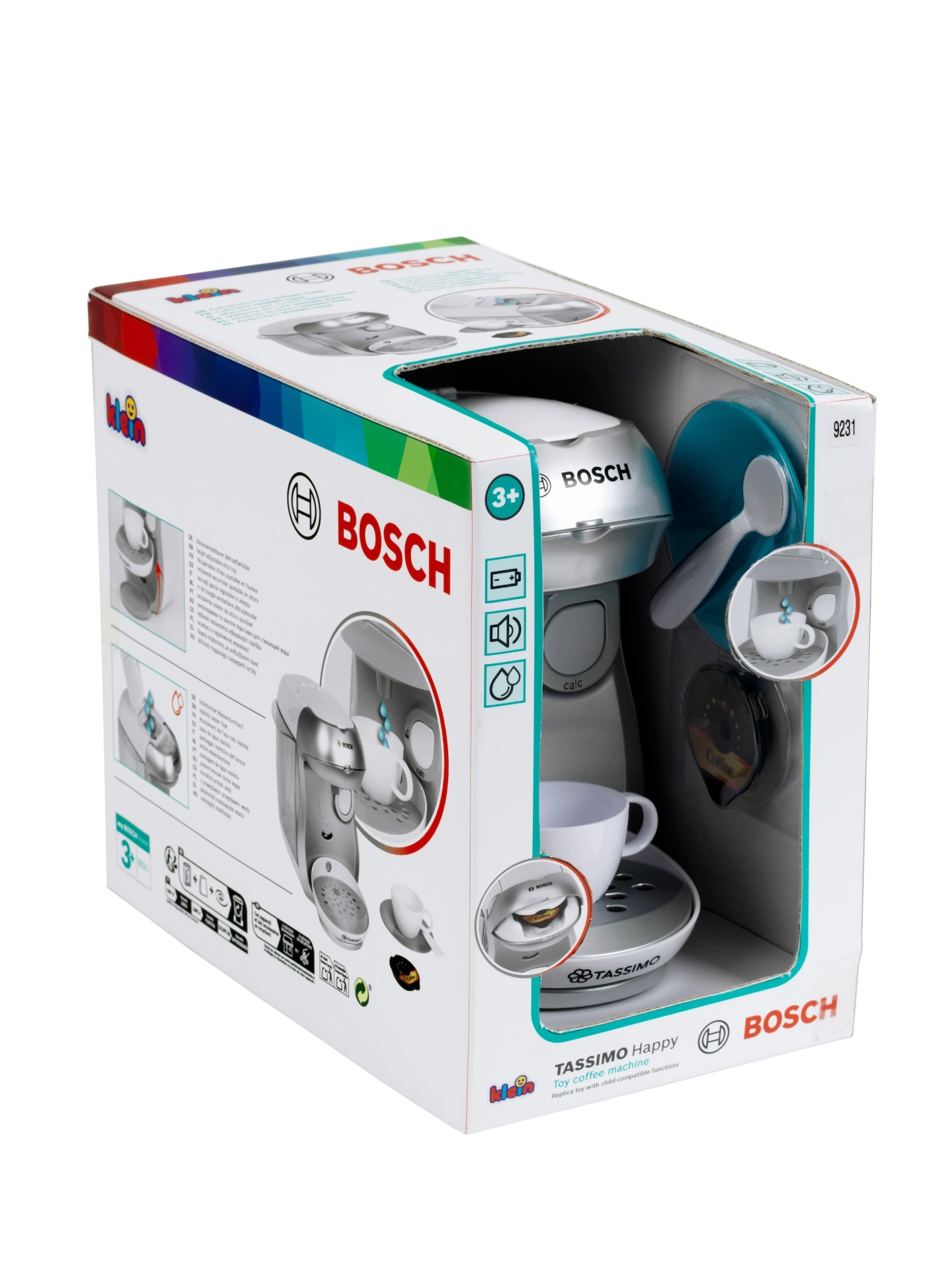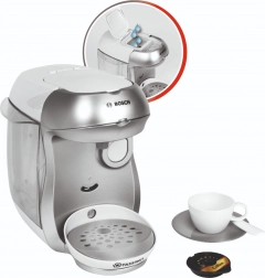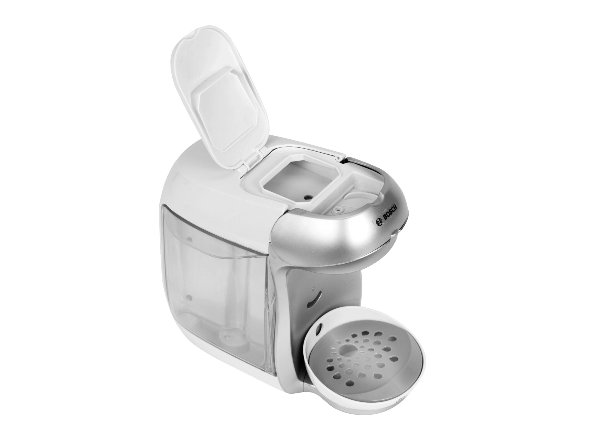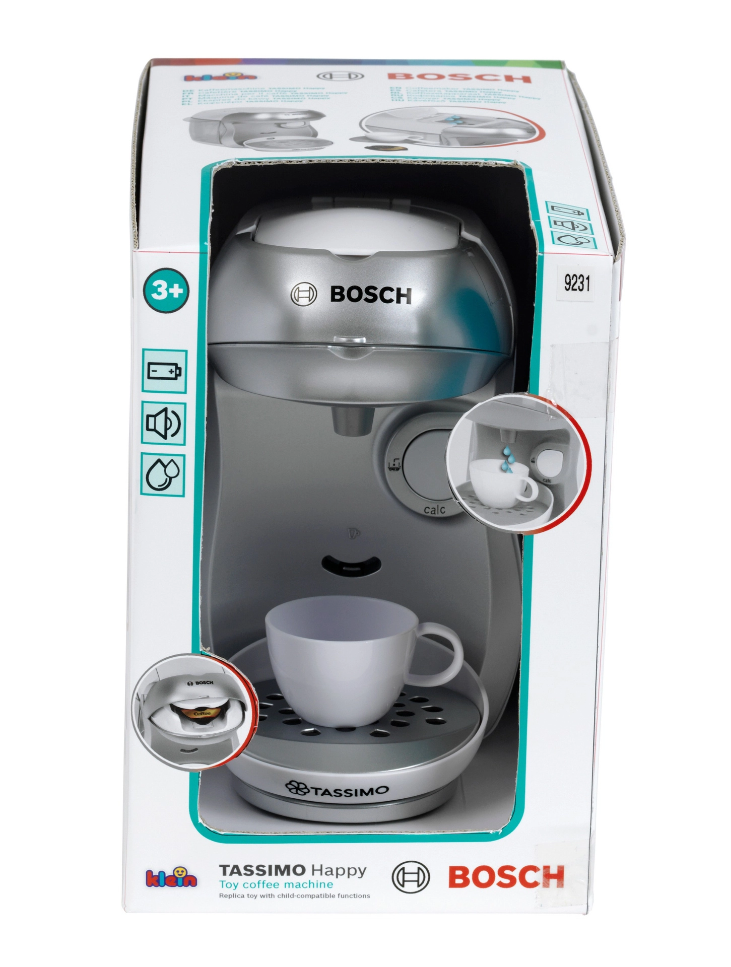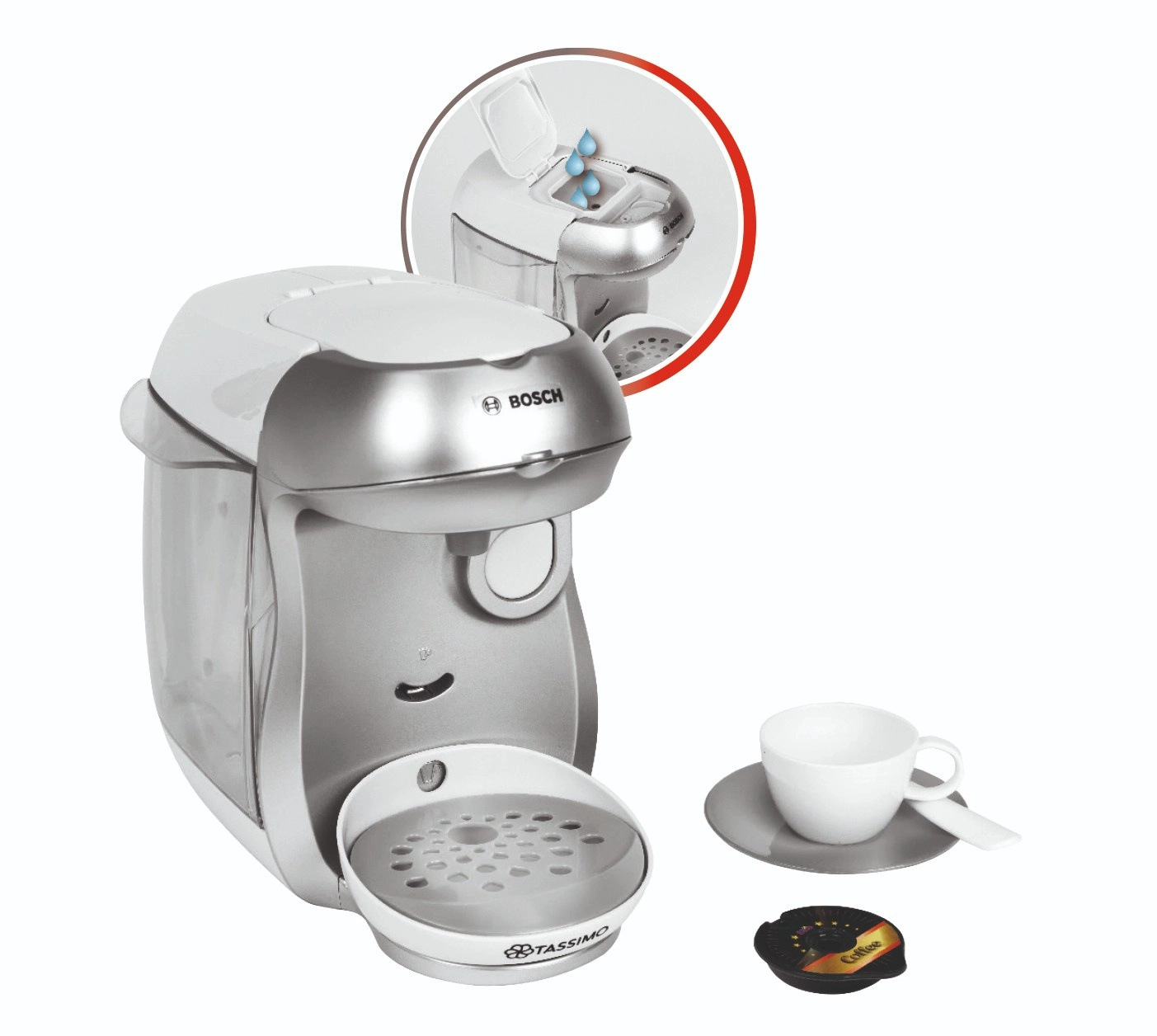 Die Kinder-Kaffeemaschine TASSIMO BOSCH in Weiß-Silber imitiert ein echtes Gerät täuschend echt, ist jedoch vollkommen kindersicher. Einfach Wasser in den Tank füllen, eine Kapsel unter den oberen Deckel einlegen und die große Start/Stop-Taste drücken – die Maschine startet den Wasserfluss und ergänzt ihn durch authentische Geräusche für ein noch realistischeres Spielerlebnis.