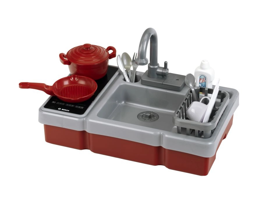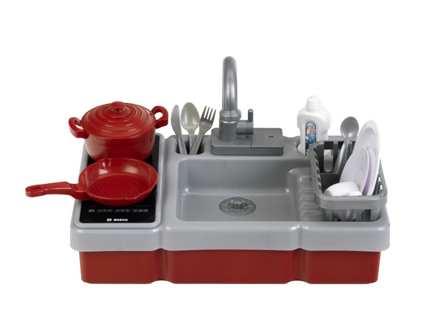 Einfach den Tank füllen und den Regler drehen – das Wasser fließt wie bei einem echten Spülbecken. Kinder können sicher das Abwaschen von Tellern und Besteck ausprobieren.