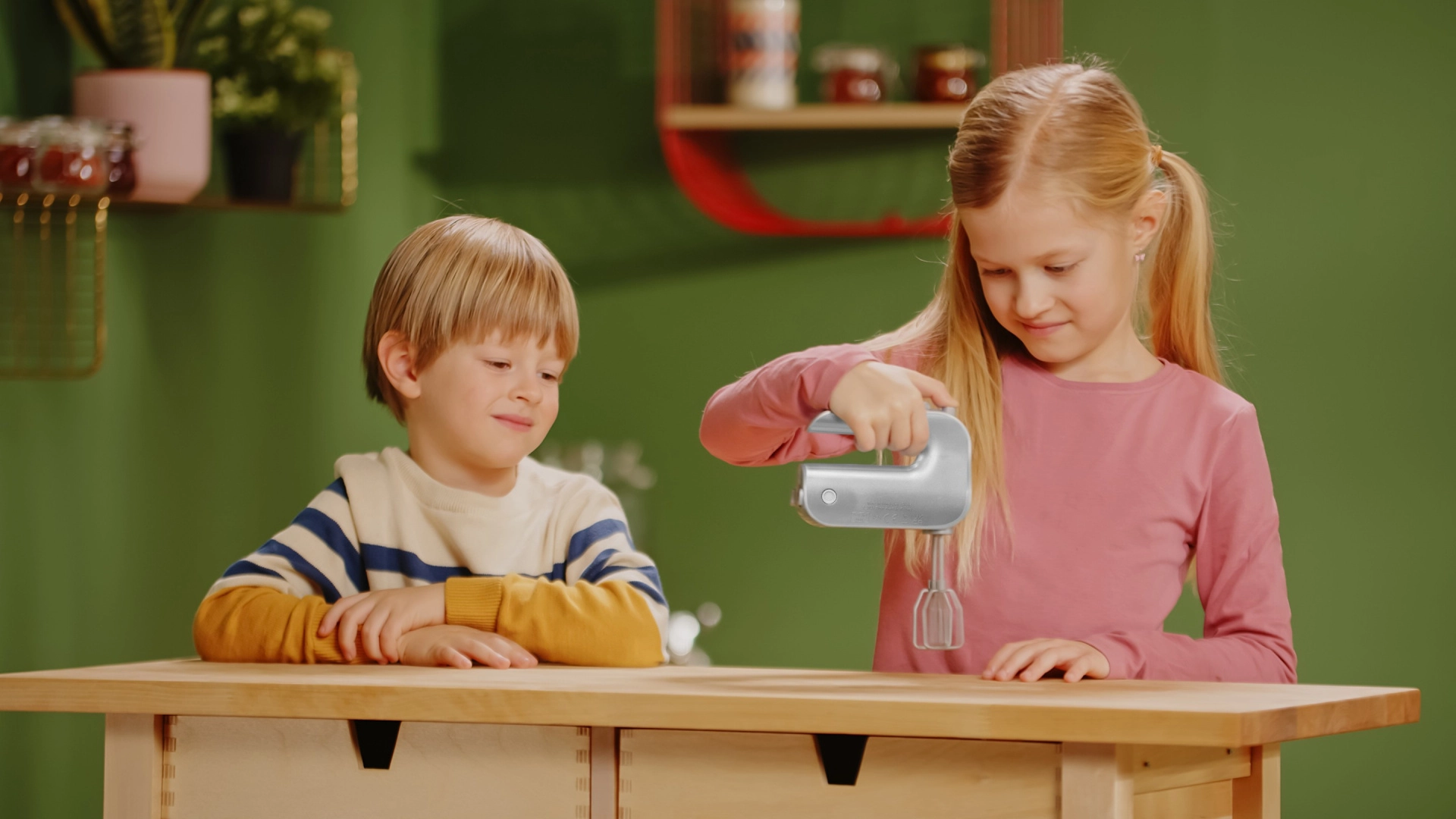Beim Drücken der Taste setzen sich die Besen in Bewegung und imitieren überzeugend die Arbeit eines echten Handmixers – Spaß und Authentizität in einem.