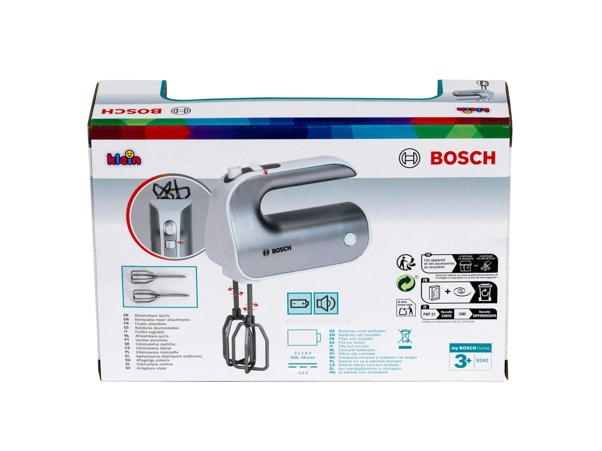 Schenken Sie Kindern Spielspaß wie in einer echten Küche. Der lizenzierte BOSCH-Mixer im silbernen Design imitiert überzeugend ein echtes Gerät: Nach Tastendruck drehen sich die Besen und ein Schiebeschalter simuliert die Geschwindigkeitswahl. Dank abnehmbarer Aufsätze erlernen Kinder auch Ordnung und Pflege.