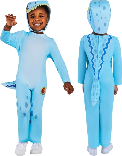 Die in Form eines Dinosaurierkopfes gestaltete Kapuze, der Fleckenprint und die dekorative Rückenlinie verleihen dem Kostüm das originalgetreue Aussehen eines Velociraptors aus JURASSIC WORLD.