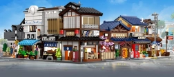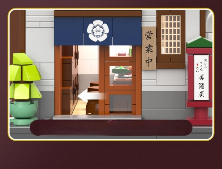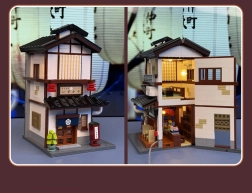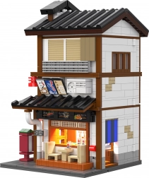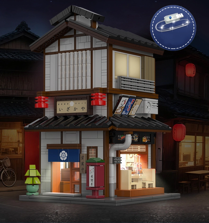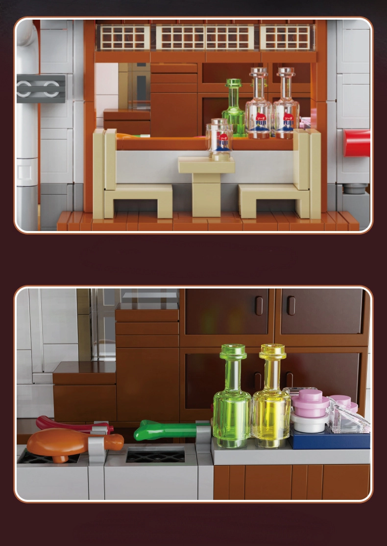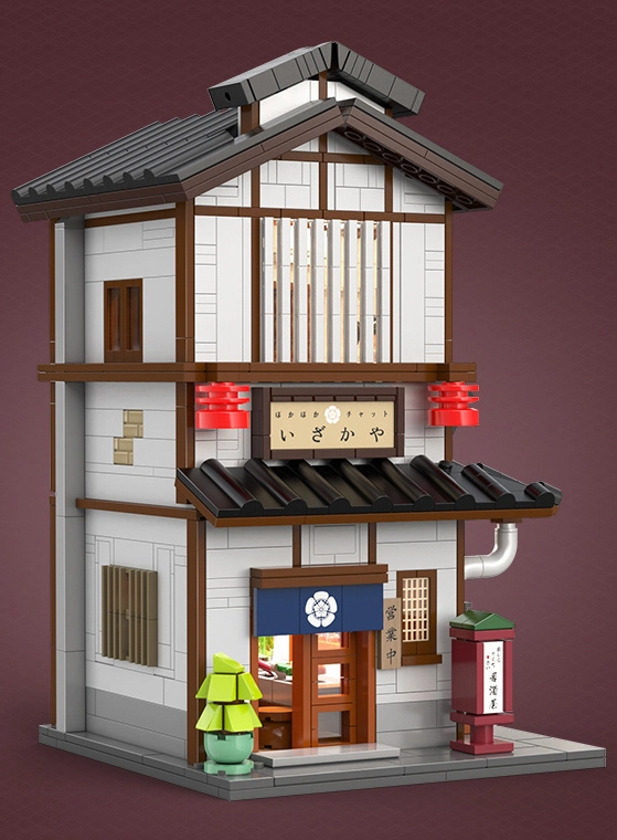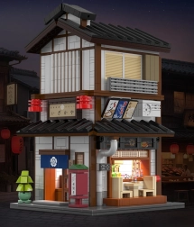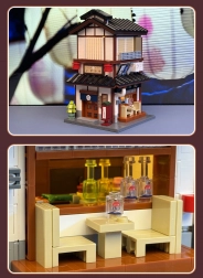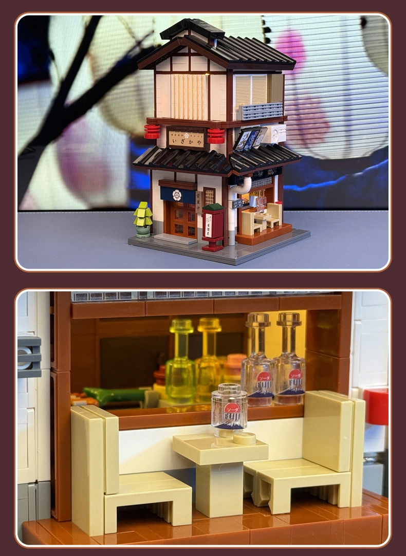 Im Erdgeschoss erwartet Sie ein gemütlicher Raum mit Tresen und Grill, im Obergeschoss ein intimer Teeraum. Schiebetüren und umfangreiches Zubehör (Essen, Teeset) machen das Modell zu einem großartigen Ausstellungsstück und zu einem unterhaltsamen Projekt für Baumeister ab 14 Jahren. LED-Lichter mit Effekten unterstreichen die Atmosphäre und lassen das Modell am Abend förmlich lebendig werden.