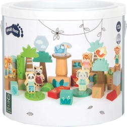 Das Set enthält Würfel, Zylinder, Bögen und bedruckte Teile in natürlichen und pastelligen Farben, die Fantasie und räumliches Denken anregen.