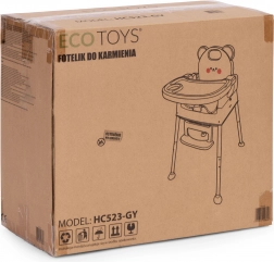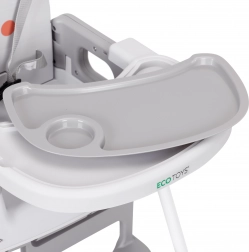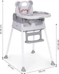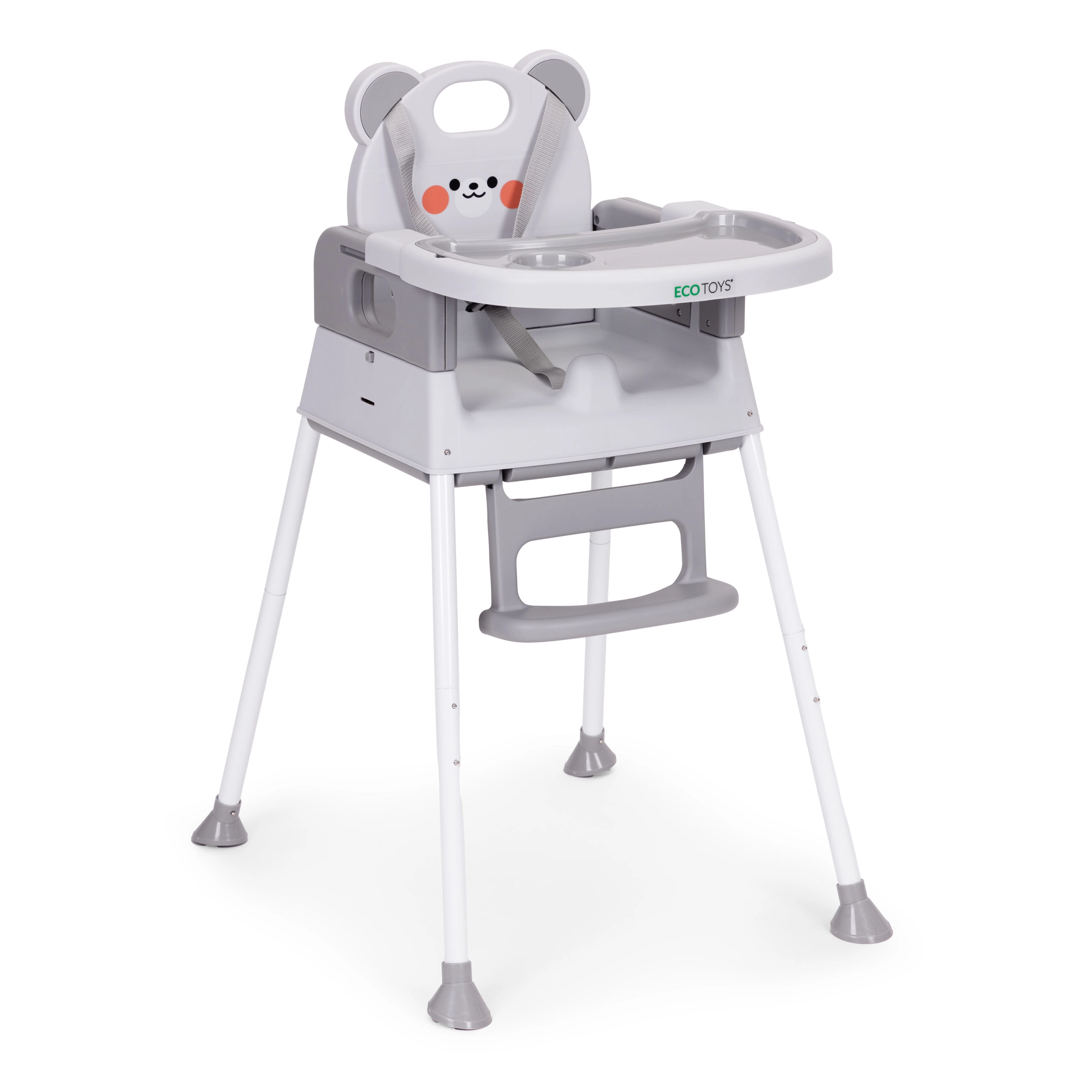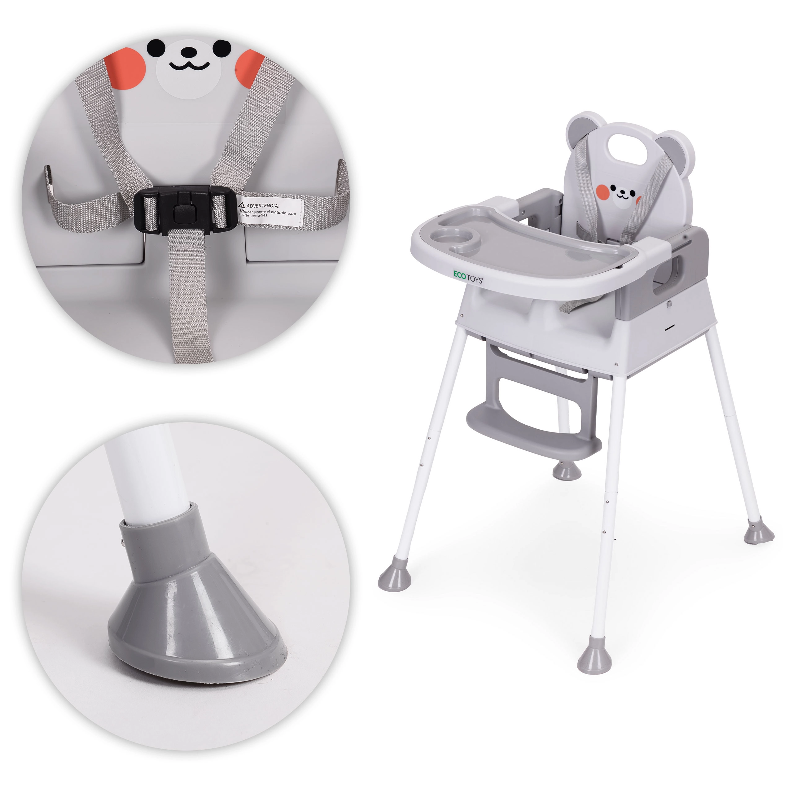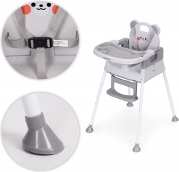 Für Sicherheit sorgen der 5-Punkt-Gurt, die Schritt-Sicherheitsbarriere gegen Abrutschen und rutschfeste Füße. Das breite Doppeltablett mit erhöhten Rändern und Becherhalter ist verstellbar; die obere Schicht lässt sich leicht abnehmen und in der Spülmaschine reinigen. Fußstütze und ergonomischer Sitz gewährleisten richtige Sitzhaltung und Komfort beim Essen und Spielen.