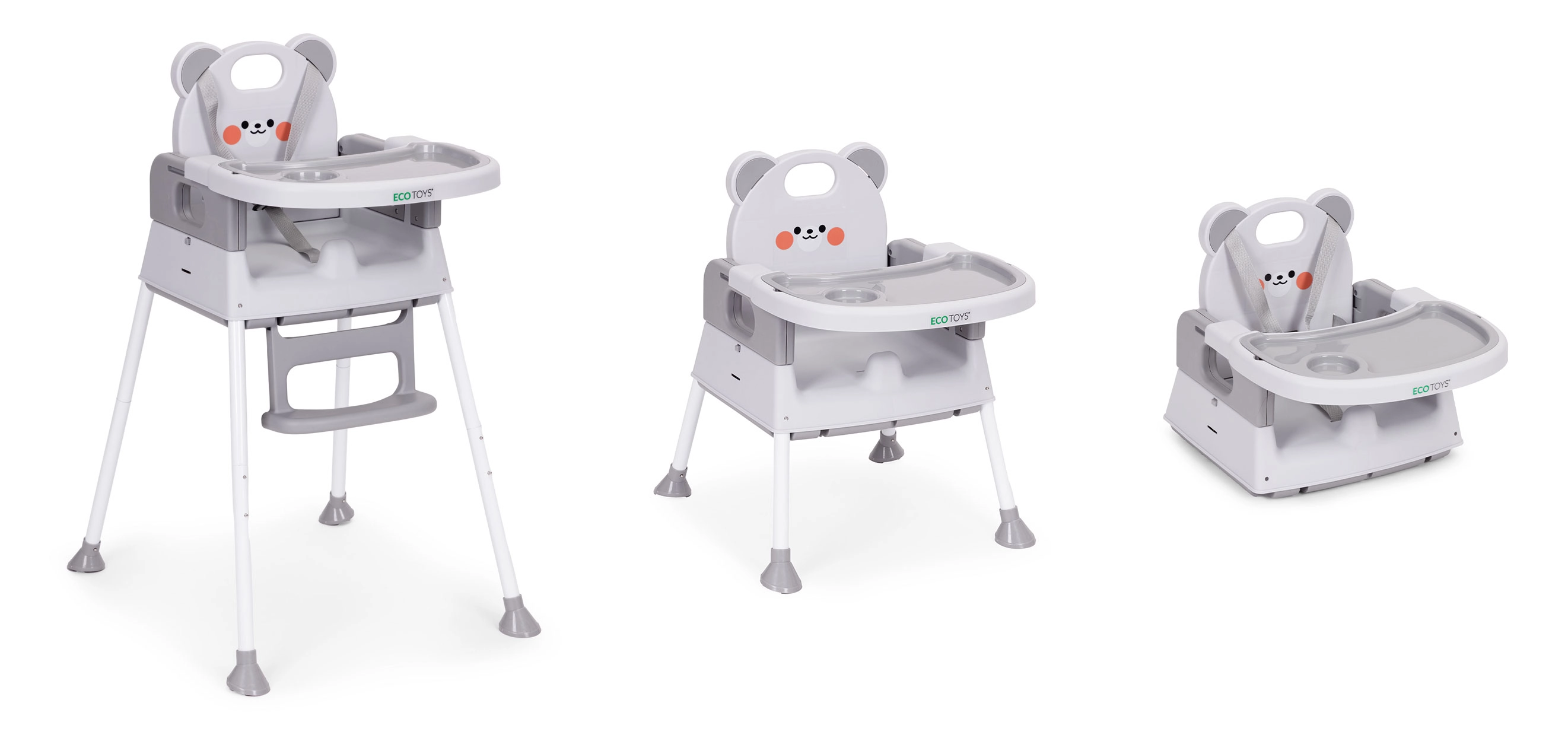 Dieser multifunktionale 3-in-1-Hochstuhl ermöglicht gemeinsames Essen mit der Familie und spart zugleich Platz. Dank der einfachen Umrüstung kann er als Hochstuhl, niedriger Stuhl oder Sitzerhöhung genutzt werden – ideal für die Küche, kleine Räume und Reisen.