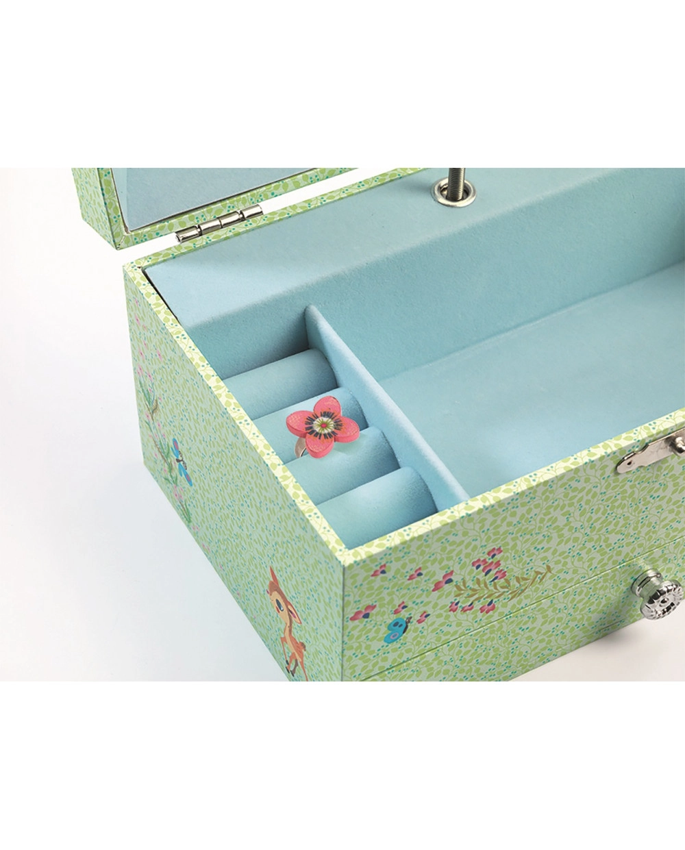 Entdecken Sie den Zauber kindlicher Erinnerungen mit dem Spieluhr-Schmuckkästchen Singendes Rehkitz von DJECO. Beim Öffnen des Deckels beginnt das niedliche Rehkitz zu tanzen und eine Melodie erklingt, die Kleine wie Große erfreut. Das Kästchen bietet Platz für Ringe, Armbänder und weitere kleine Schätze, die so immer an einem Ort aufbewahrt sind.