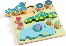 Entdecken Sie das verspielte Einlegepuzzle mit Tieren in Autos von Djeco. Die Teile sind an kleine Kinderhände angepasst, haben glatte Kanten und ansprechende Farben, die die Wahrnehmung von Formen und Farben fördern. Nach dem richtigen Einsetzen der Teile kann sich das Puzzle „in Bewegung setzen“, was eine zusätzliche Dimension des Spielspaßes bringt.