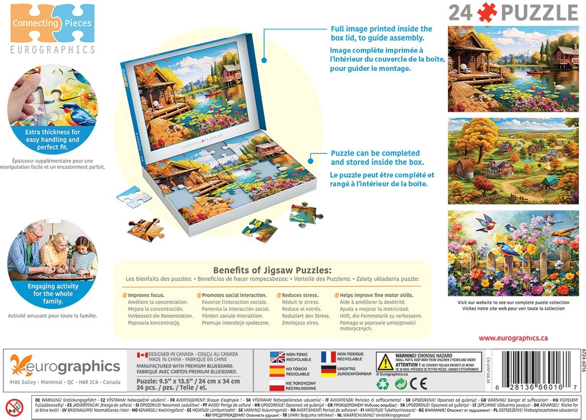 Entdecken Sie entspannendes Puzzeln mit dem Motiv einer Hütte am See. Die Puzzles der Connecting-Pieces-Kollektion sind so gestaltet, dass sie Spaß mit Training für Geist und Feinmotorik verbinden. Dank der größeren Teile und dem Puzzeln direkt in der Schachtel gelingt es bequem überall – zu Hause, unterwegs oder in Pflegeeinrichtungen.