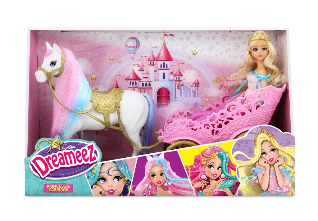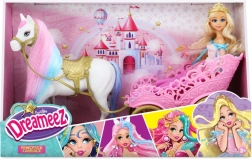 Entdecken Sie eine märchenhafte Welt mit dem perfekten DREAMEEZ-Set – Prinzessin, Pferd und Kutsche bilden ein komplettes Spielset für kleine Prinzessinnen. Die Puppe in einem wunderschönen rosa Kleid aus Satin und feinem Tüll mit glitzernden Details, langen welligen blonden Haaren und einem goldenen Diadem in Kronenform begeistert auf den ersten Blick.