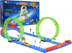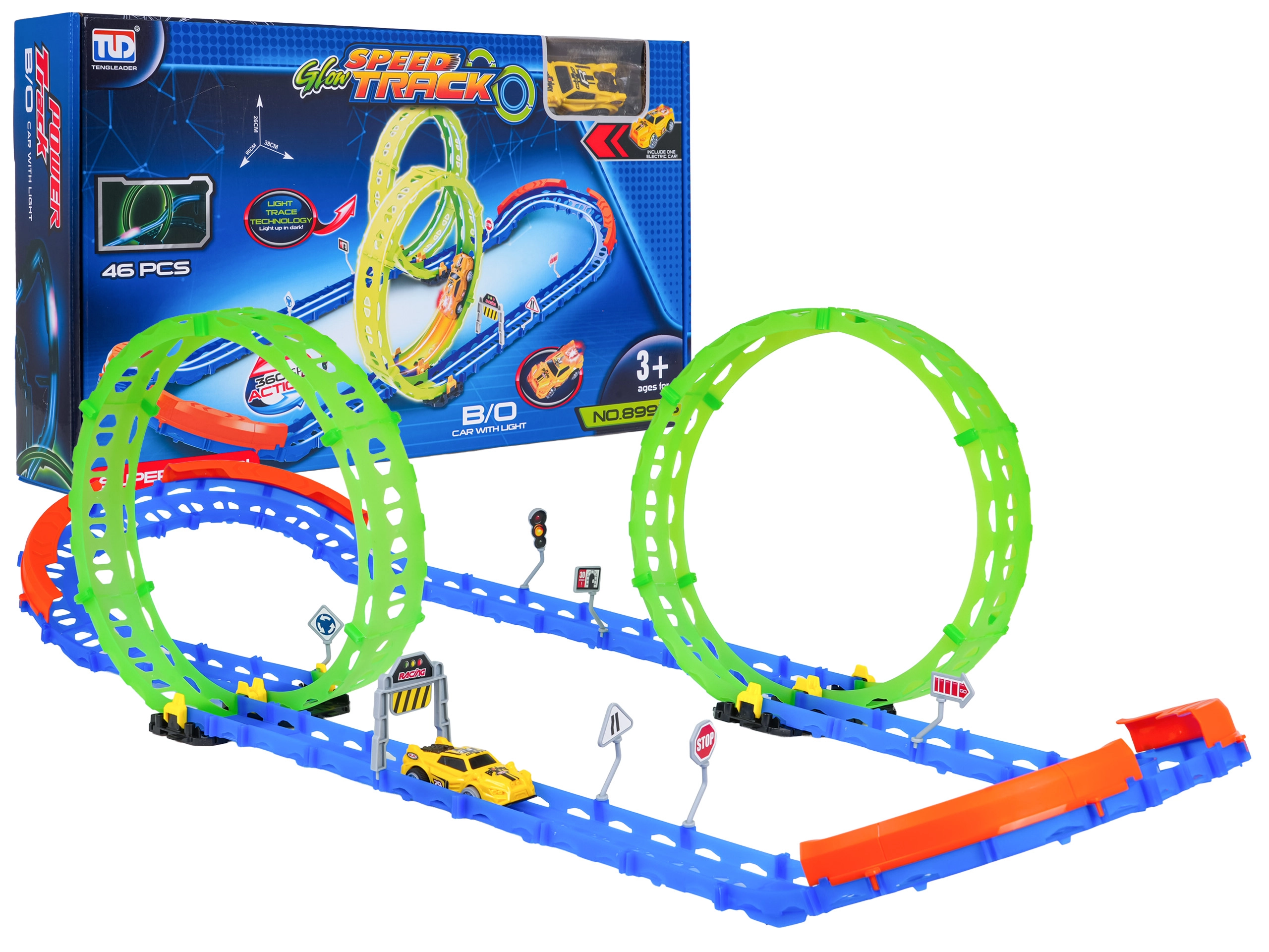 Zwei große fluoreszierende Loops sorgen auch bei ausgeschaltetem Licht für beeindruckende Stunt-Durchfahrten und machen das Rennen unvergesslich.