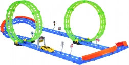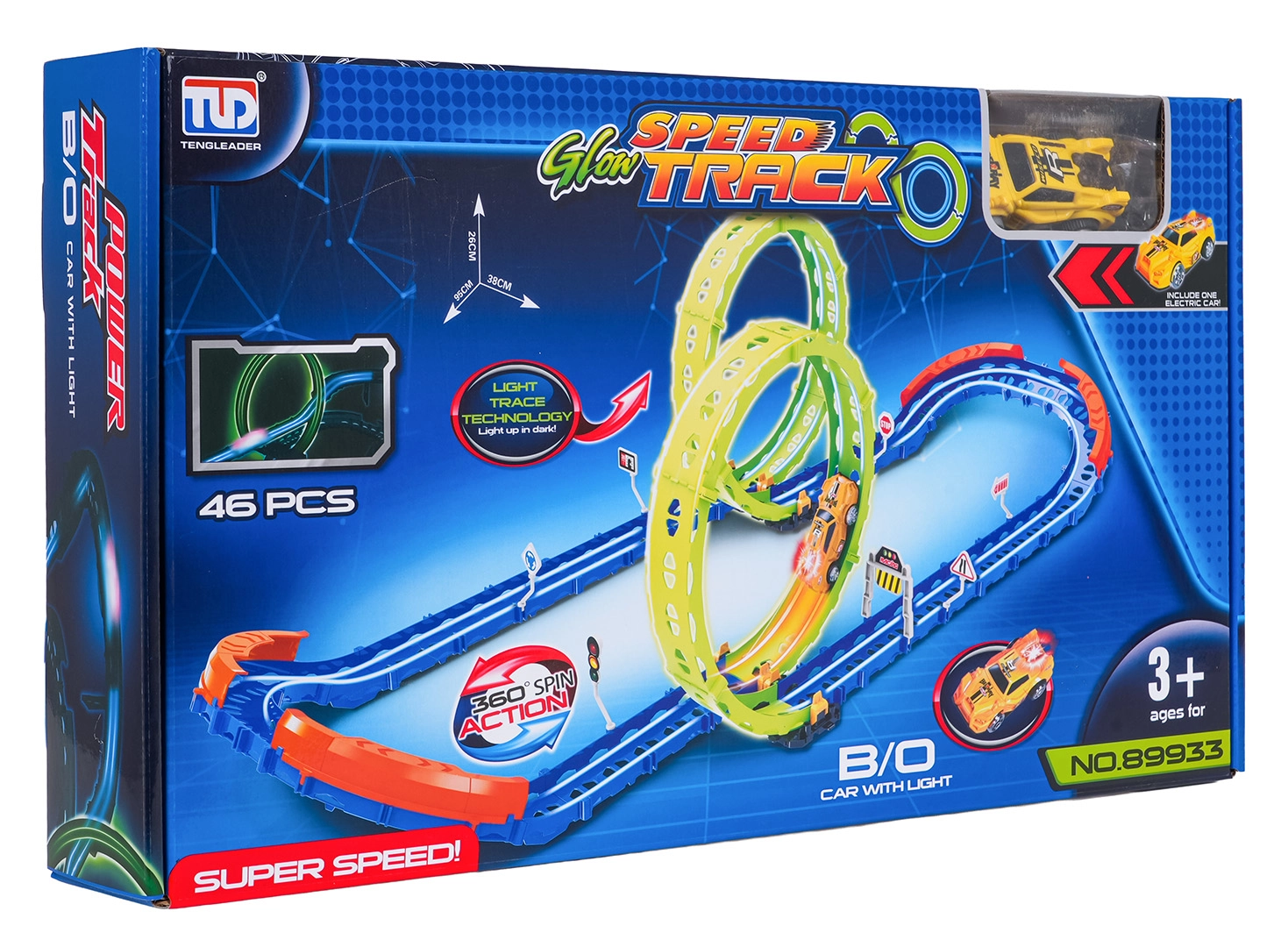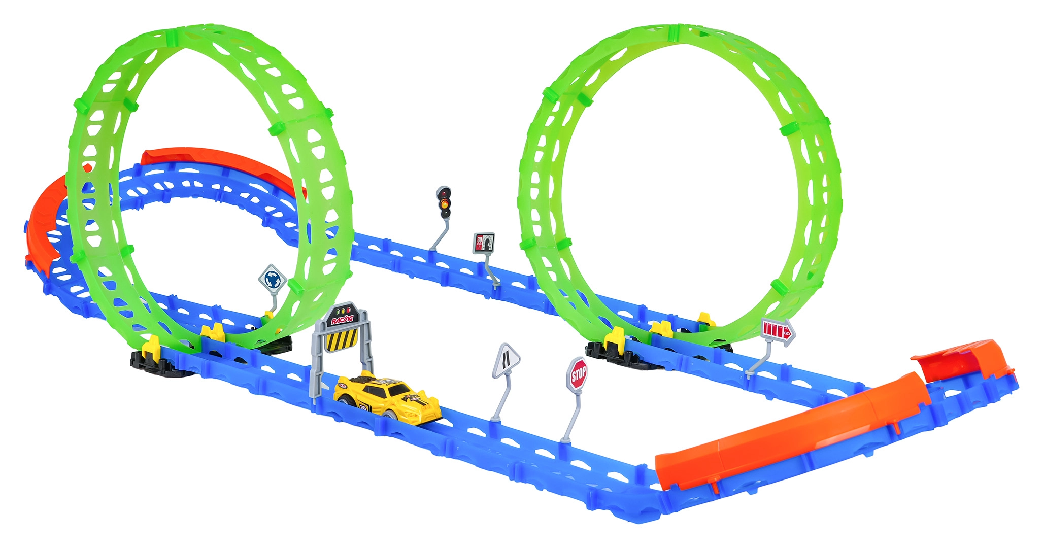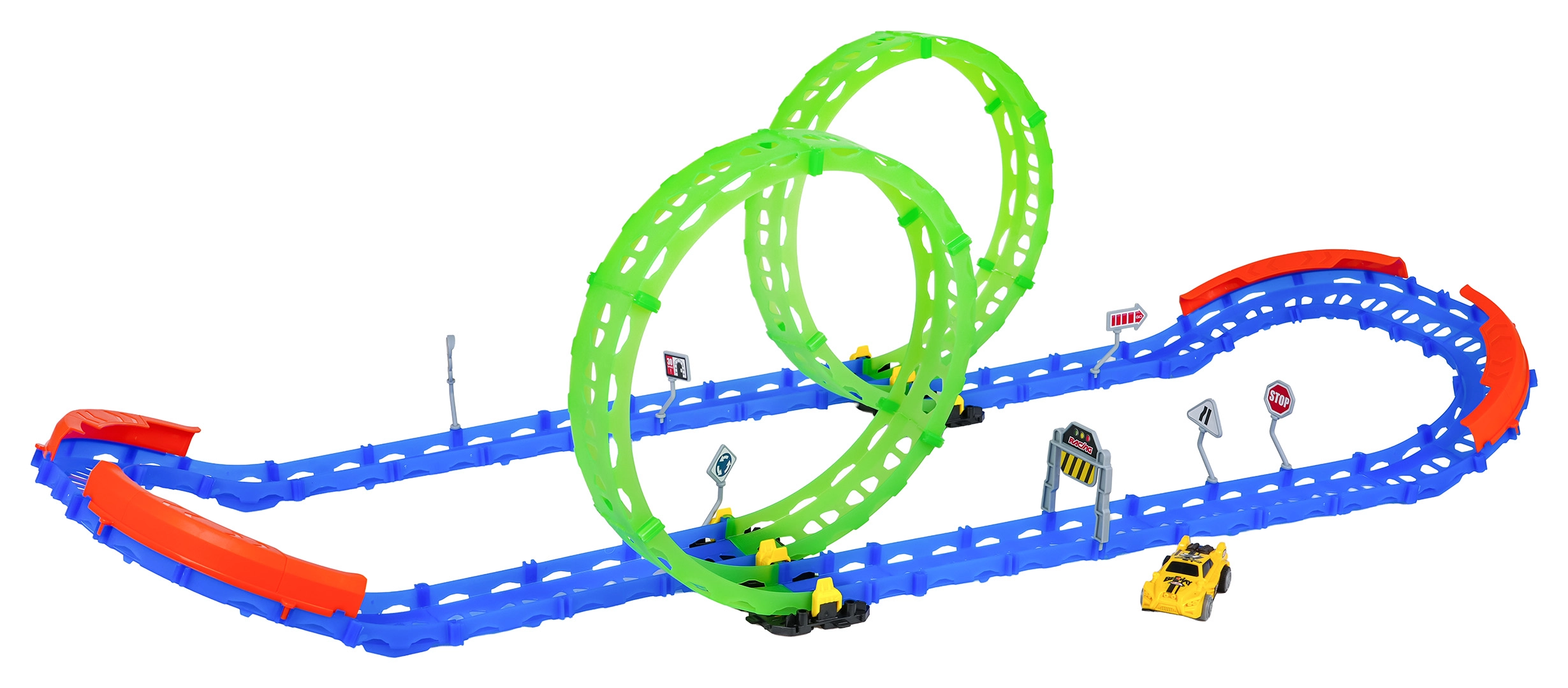 Das Set enthält 46 Teile für einen einfachen Aufbau, ein gelbes Rennauto mit funktionierendem Rücklicht (Betrieb 2× AAA, nicht enthalten) sowie Verkehrszeichen für ein noch realistischeres Spiel. Kinder können die Strecke immer wieder neu konfigurieren und neue Rekorde ausprobieren.