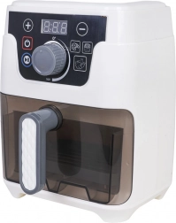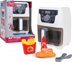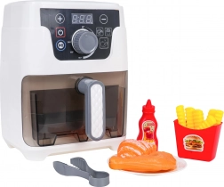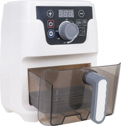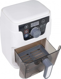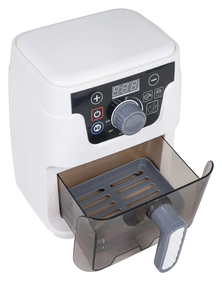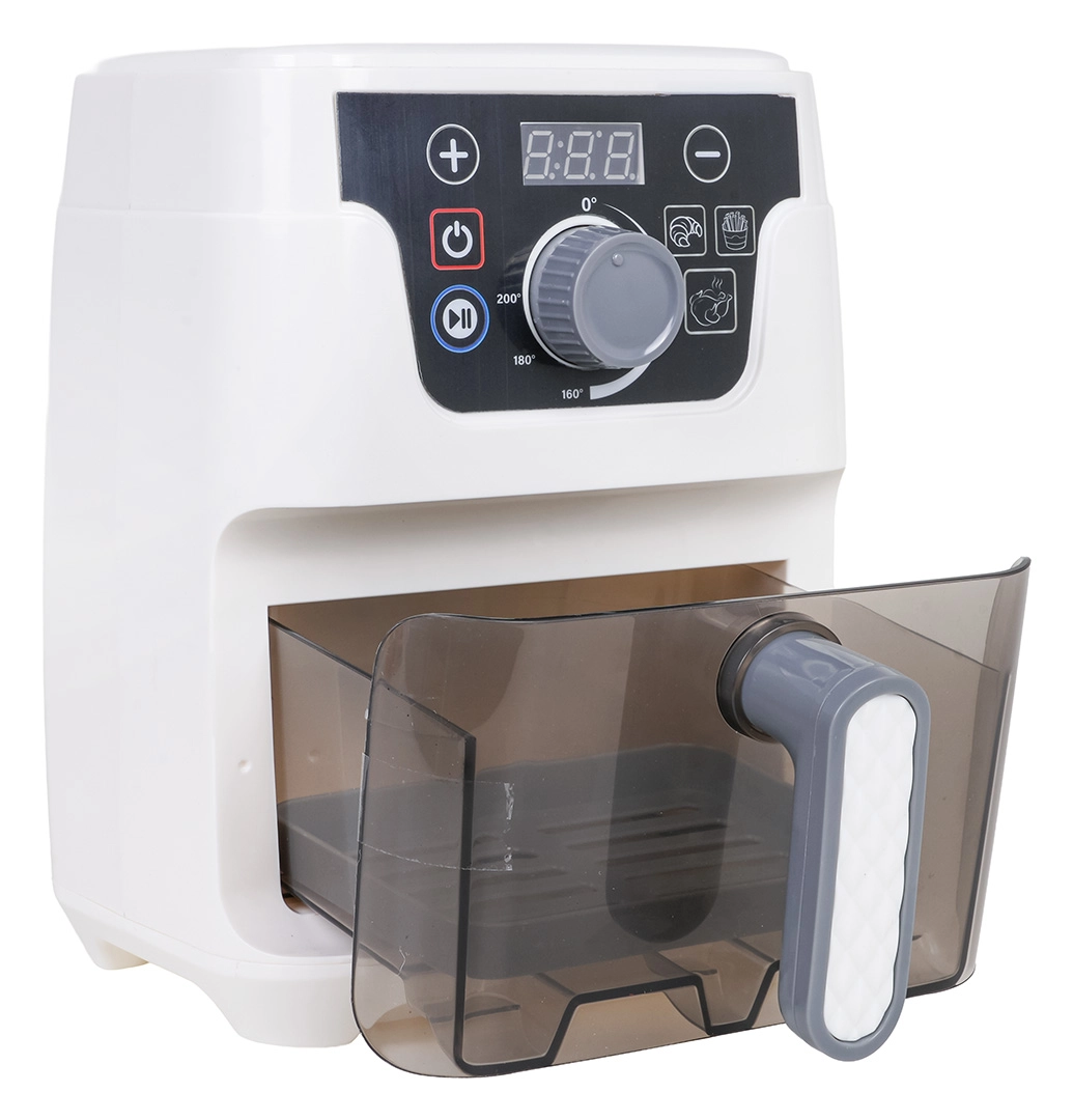 Dieser detailreich gestaltete Kinder-Airfryer sieht aus und funktioniert wie ein echtes Gerät: Er hat einen beleuchteten Korb, ein digitales Display und Geräusche für Backen, Frittieren sowie Öffnen/Schließen der Schublade. Automatikprogramme zeigen die Zeit auf dem Display an (Brötchen 2:50, Pommes 2:00, Hähnchen 3:00) und nach Zyklusende schaltet sich das Gerät mit einem akustischen Signal automatisch ab.