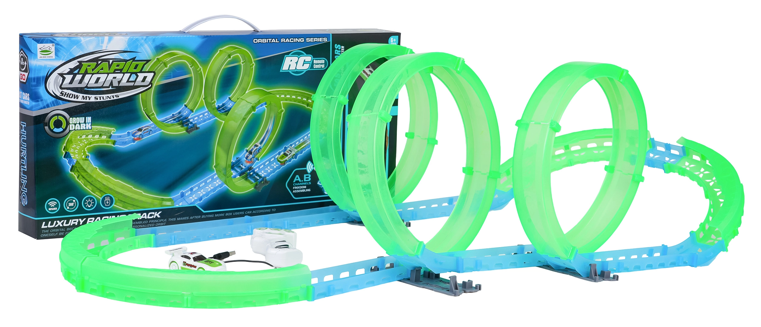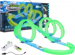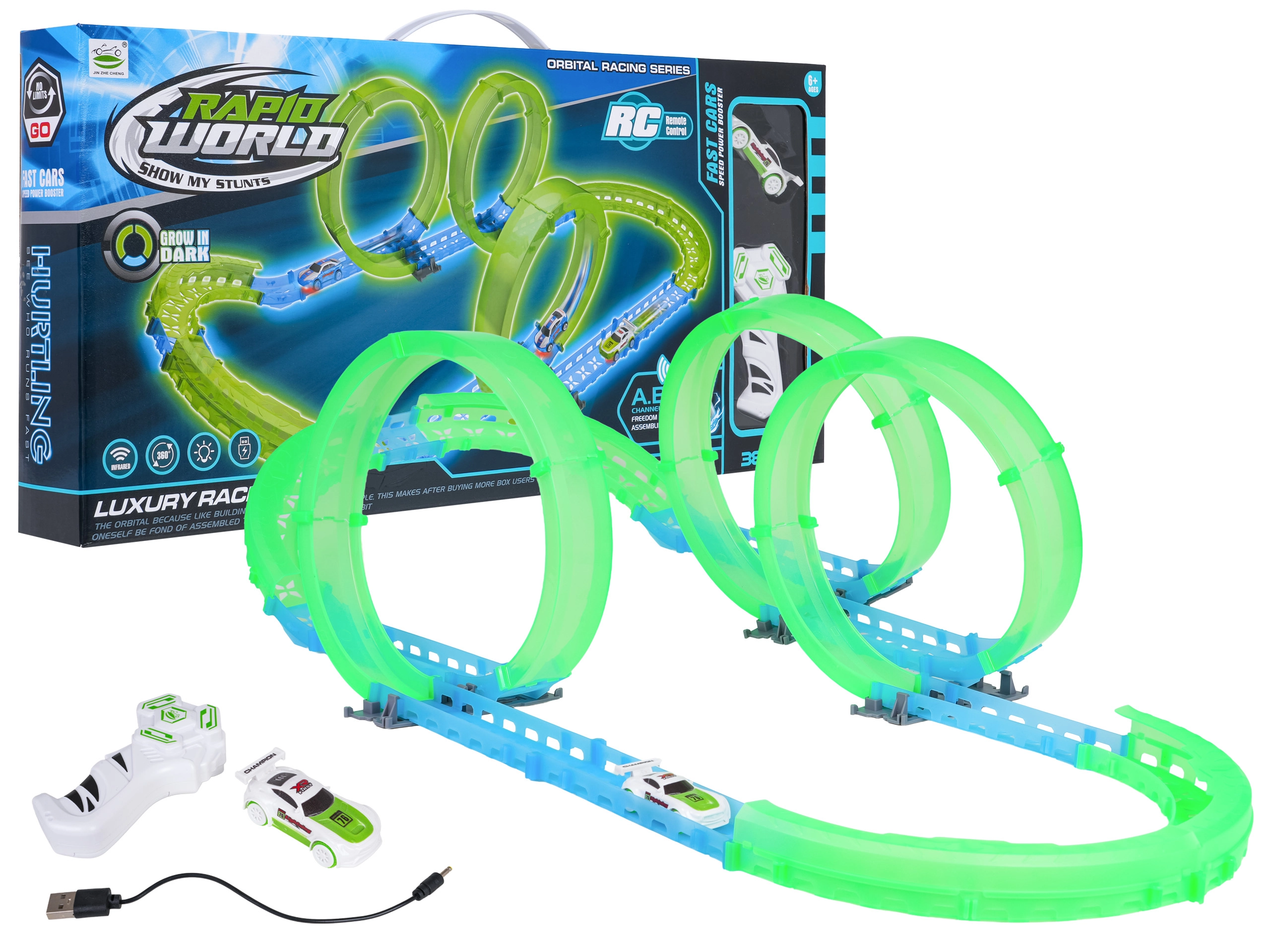 Leuchtende Rennstrecke für Kinder ab 6 Jahren bietet actionreiche Fahrten mit einem RC-Auto mit LED-Beleuchtung. Die fluoreszierende Strecke leuchtet im Dunkeln, das Auto wird über USB geladen und die Fernbedienung läuft mit 2× AAA-Batterien (nicht enthalten). Einfache Montage, tolle Lichteffekte und Spielspaß, der Koordination und Vorstellungskraft fördert.
