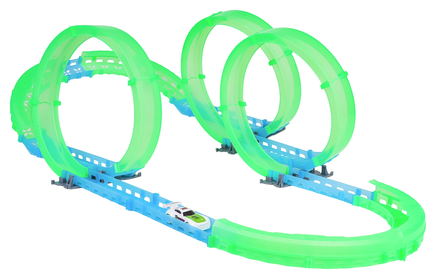 Baue deine eigene Stuntstrecke und fahre auch nach Einbruch der Dunkelheit. Fluoreszierende Elemente leuchten im Dunkeln und das kleine RC-Auto fährt vorwärts auf der vorbereiteten Strecke. Dank LED-Beleuchtung entstehen während der Fahrt effektvolle Lichtspuren.