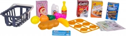 Inklusive Einkaufskorb, Lebensmittelattrappen, Euro-Banknoten und -Münzen sowie Zahlungskarte – alles für ein komplettes Einkaufsspiel.