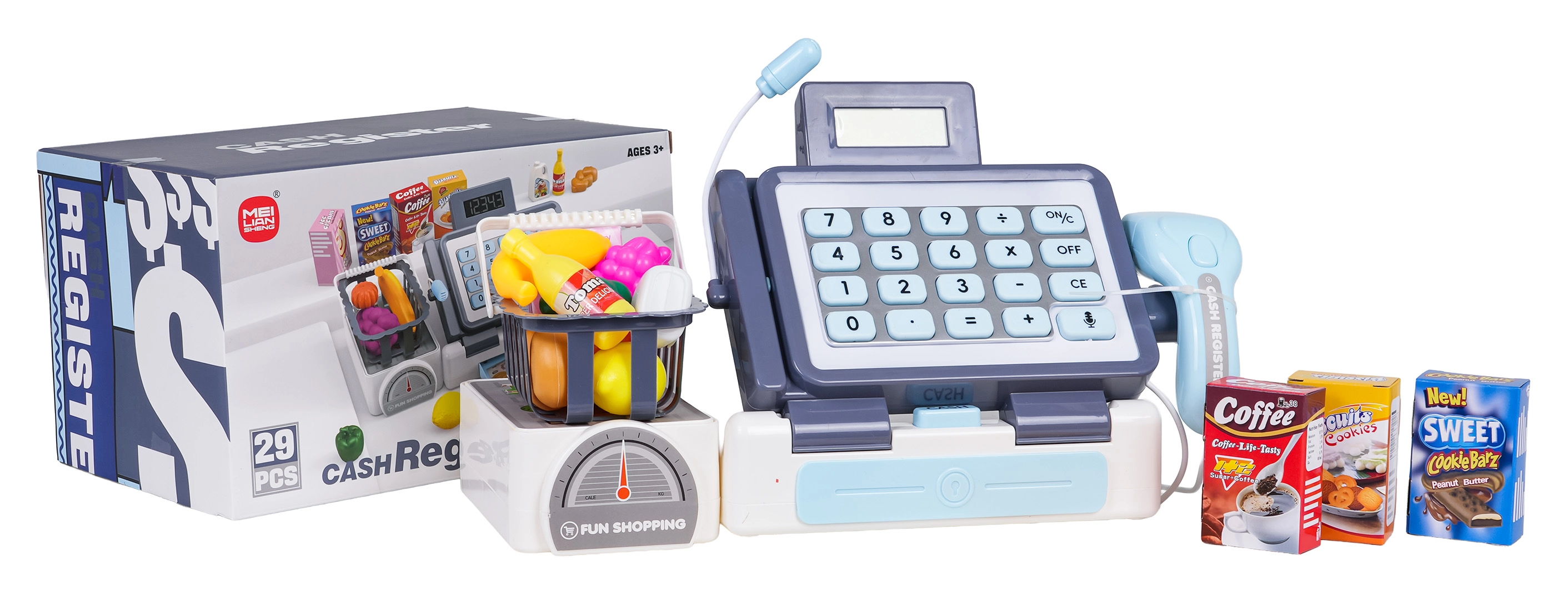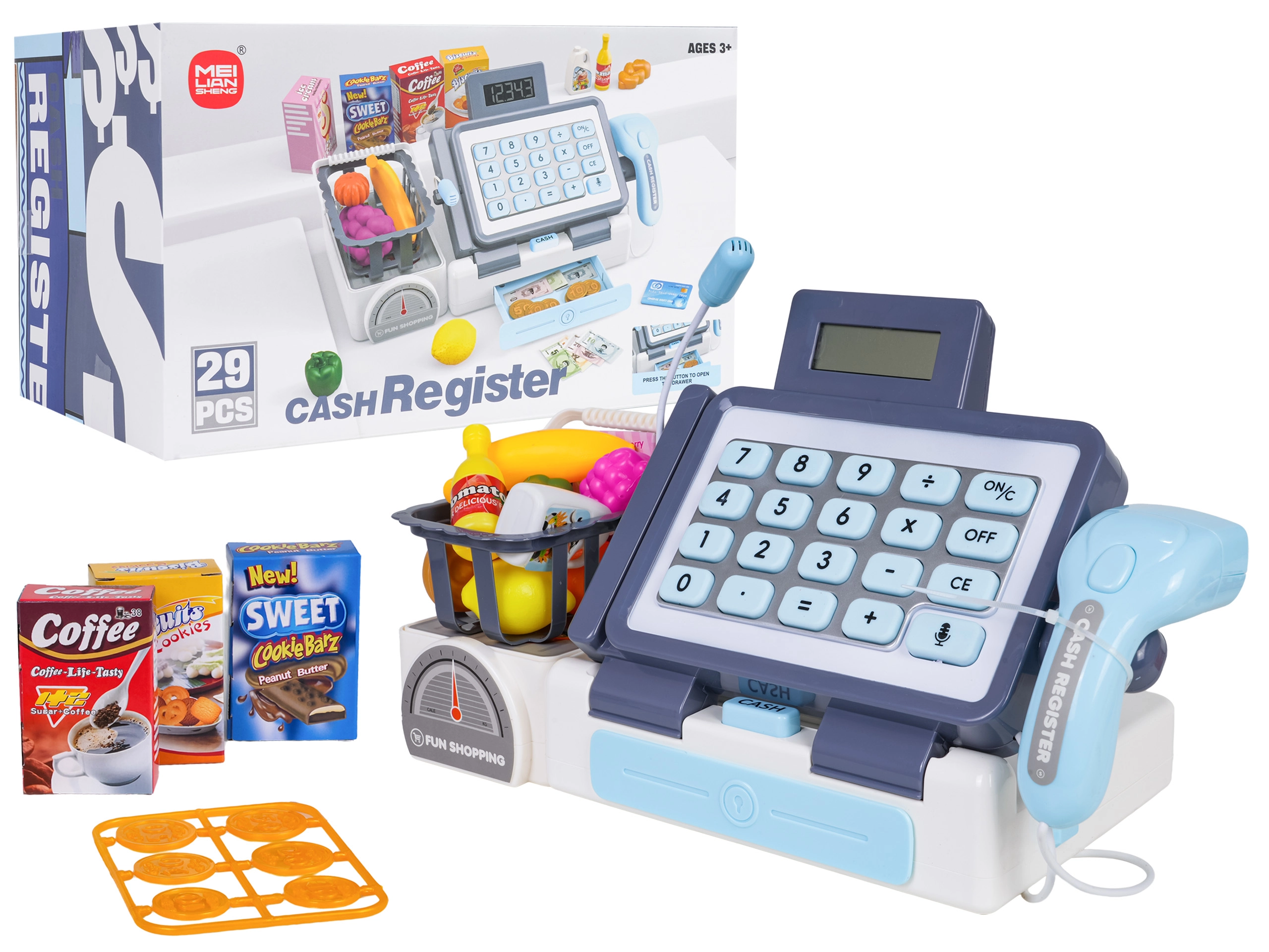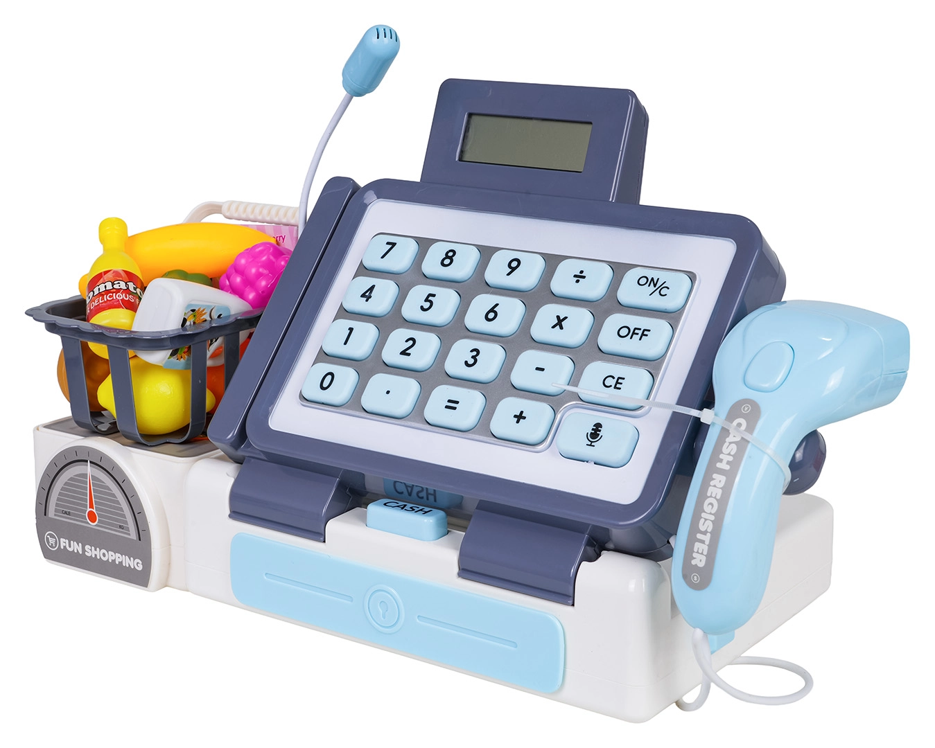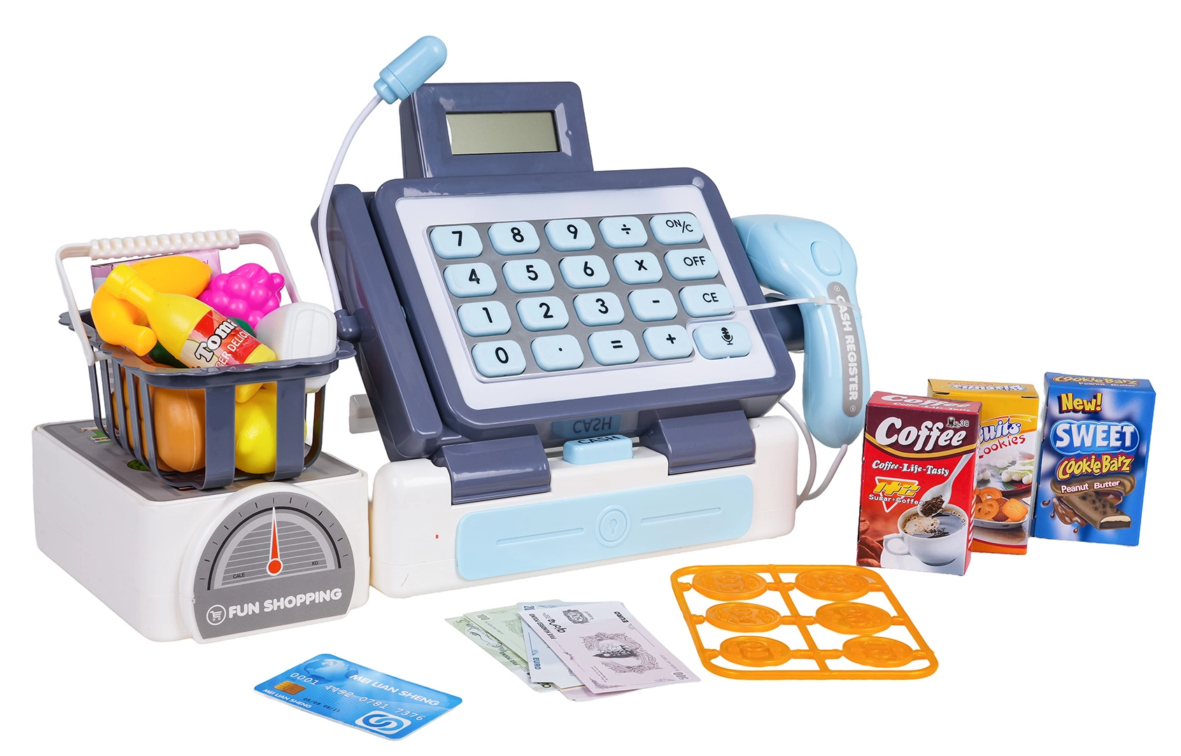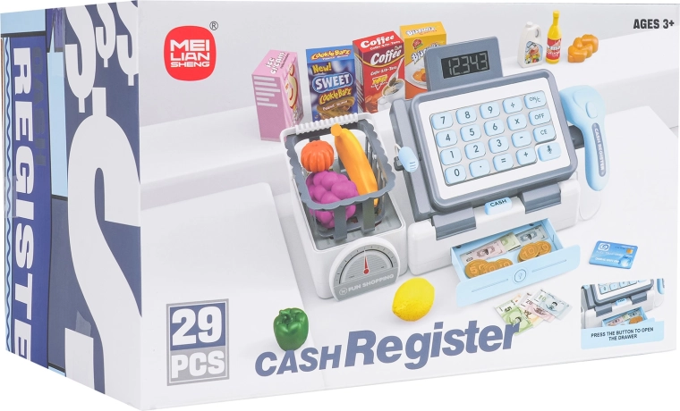 Diese realistische Kasse in lebendigen Farben besteht aus hochwertigem Kunststoff und bietet Kindern alles für authentische Kaufmannsladen-Spiele. Dank funktionierendem Rechner, Scanner mit blinkendem Licht und Sound sowie Mikrofon üben Kinder spielerisch Rechnen, Kommunikation und Feinmotorik. Enthalten sind außerdem eine Waage (Attrappe), eine Geldschublade und ein Einkaufskorb mit Lebensmitteln.
