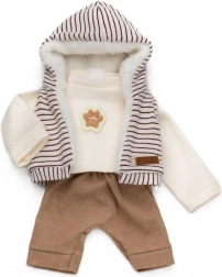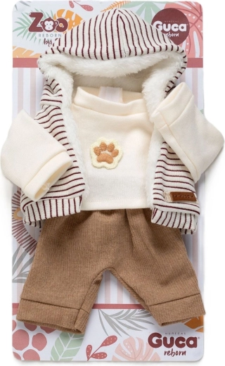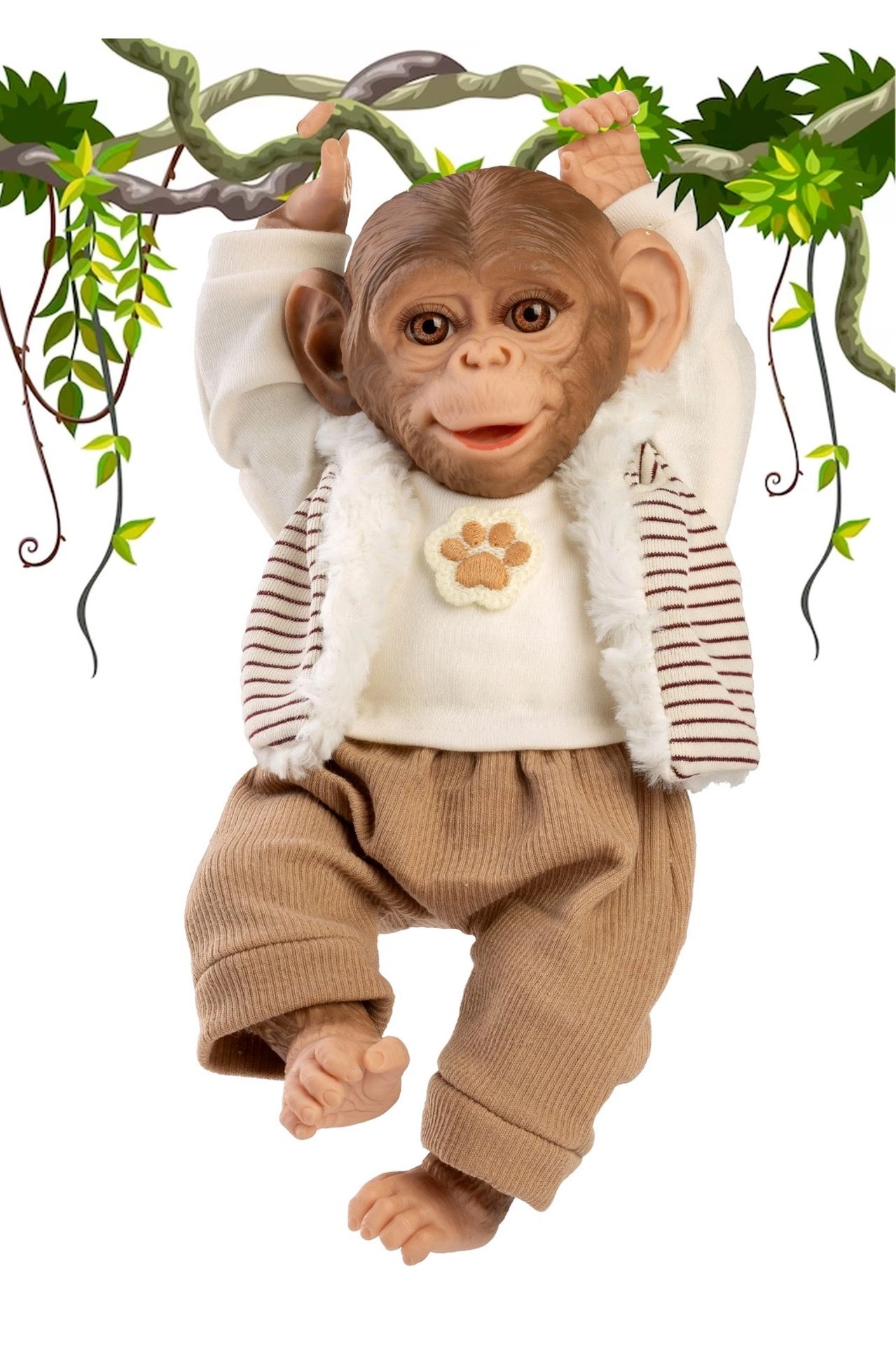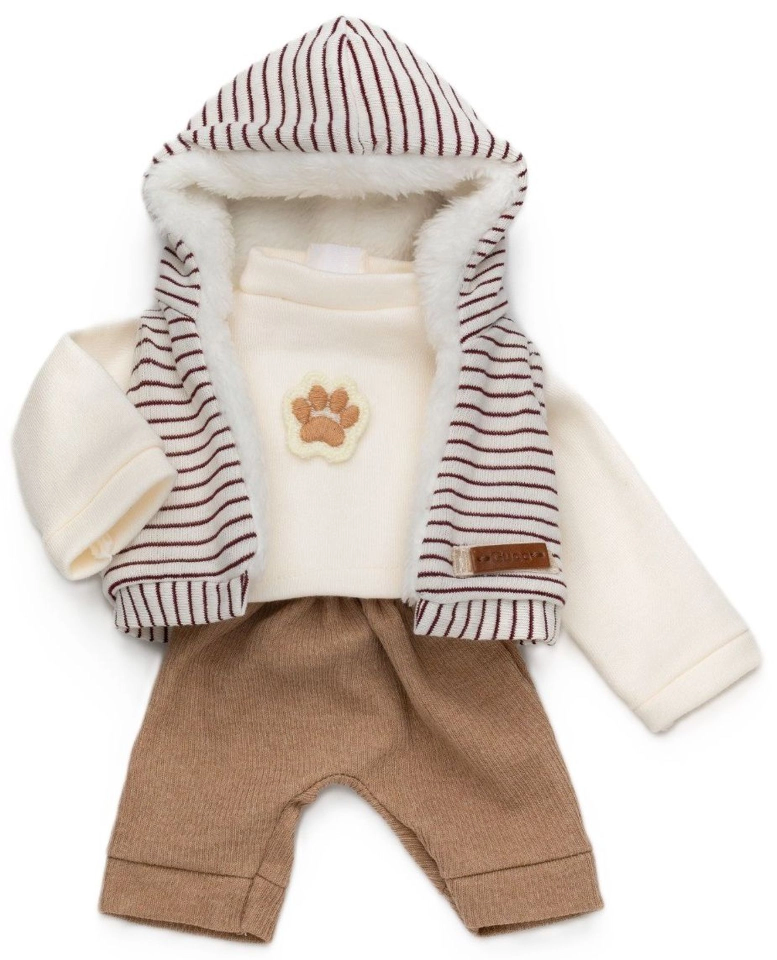 Dieses stylische Set für das Reborn-Äffchen 32 cm umfasst drei aufeinander abgestimmte Teile – ein cremefarbenes Langarmshirt mit Pfotenmotiv, eine gestreifte Weste mit Kapuze und warmem Fellfutter sowie eine bequeme Hose. Das Outfit ist für einfaches An- und Ausziehen konzipiert, damit Kinder das Aussehen ihres Lieblingsspielzeugs schnell verändern können.