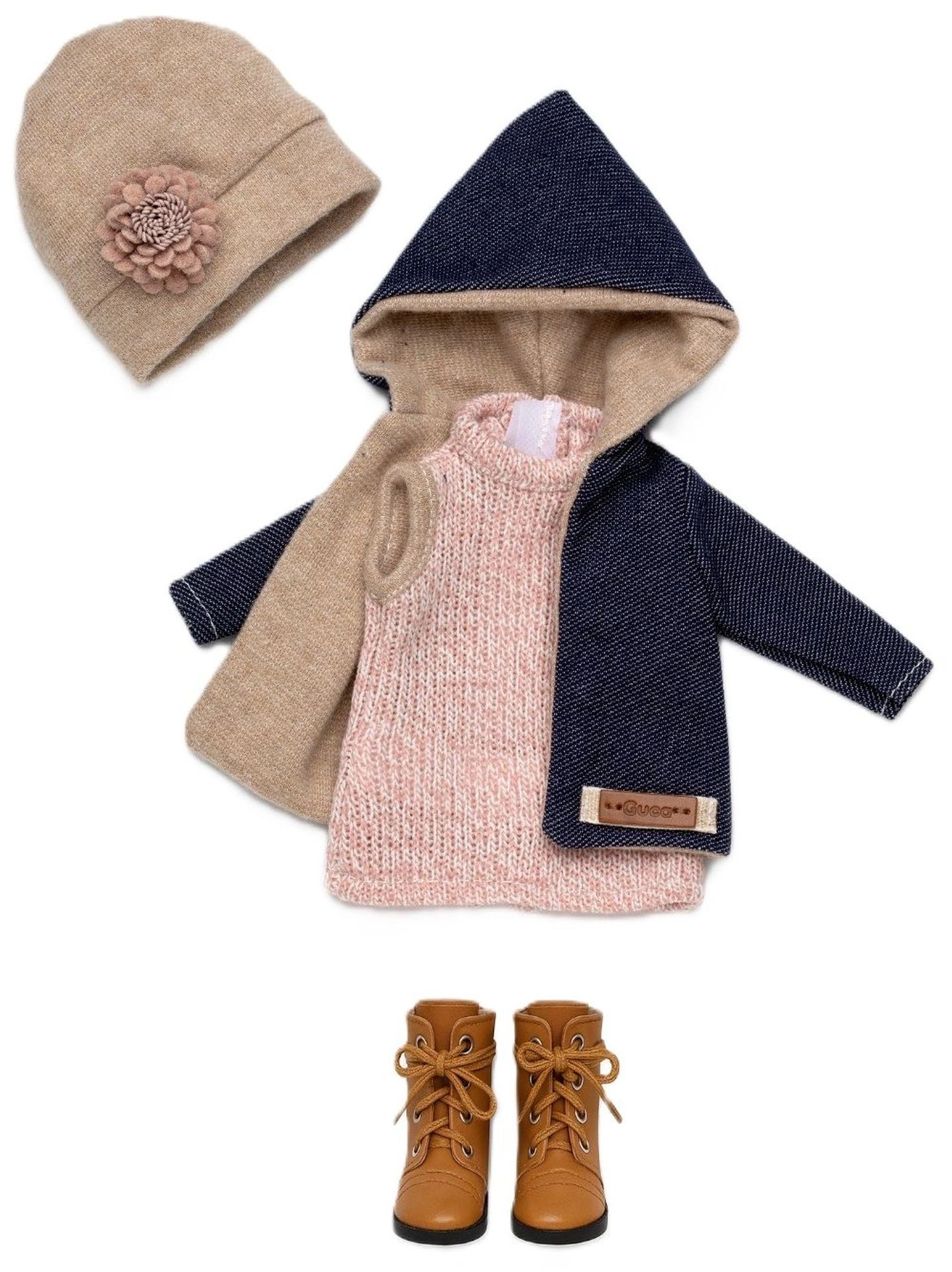 Das Kapuzenjäckchen und gestrickte Details halten die Puppe warm, während die Schühchen dem Outfit einen realistischen Touch verleihen.