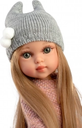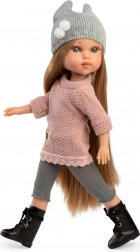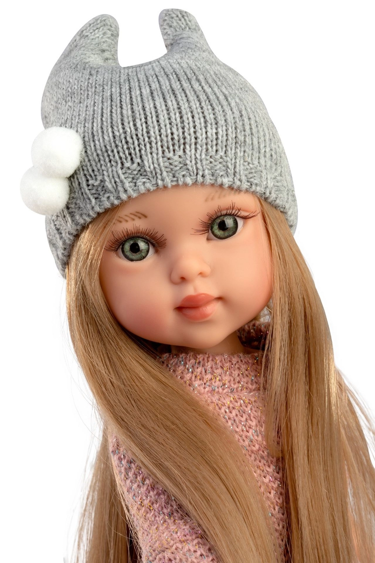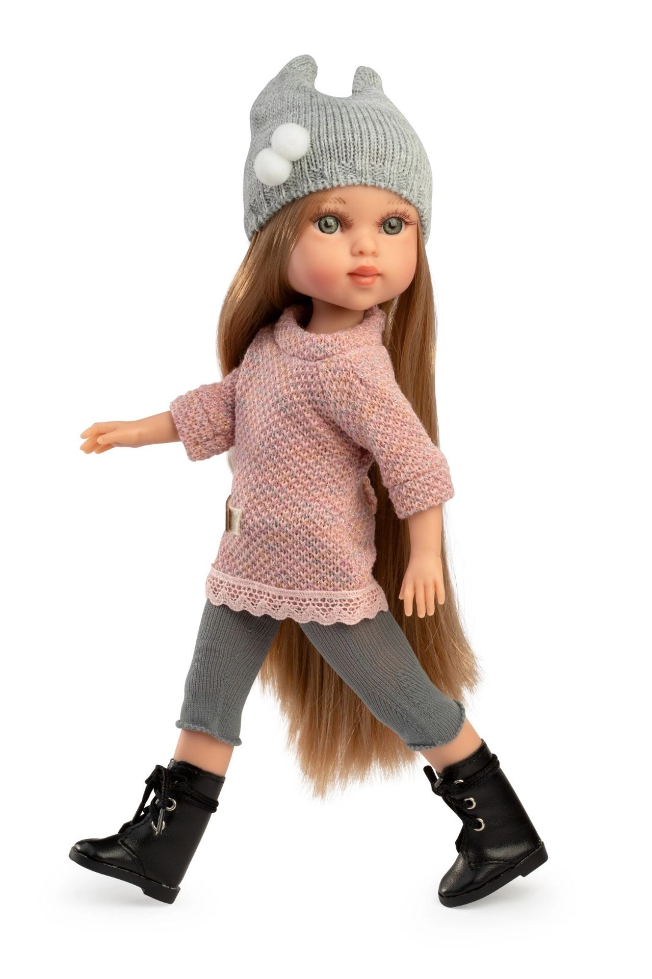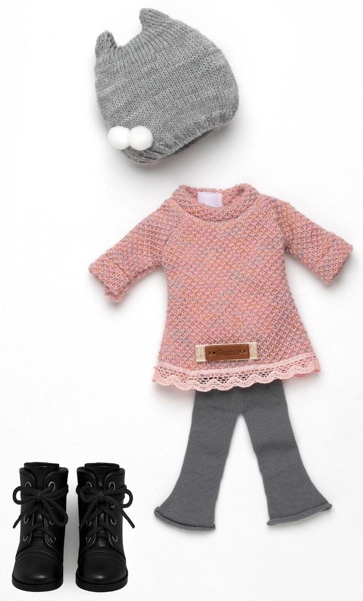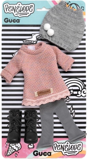 Gönnen Sie Ihrer Penelope-Puppe in 34 cm Größe eine neue Garderobe. Dieses handgefertigte Set vereint zarten Strick-Look und Komfort: rosa Tunika mit Verzierungen, graue Schlagleggings, graue Mütze mit zwei Bommeln und schwarze Schnürschuhe. Das Outfit sitzt hervorragend und unterstützt dank durchdachter Details das kreative Spiel und Styling.