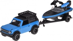 Entdecken Sie die attraktive Kombination aus Offroad-Ikone und Wasserabenteuer: Der FORD Bronco 2021 im Maßstab 1:64 zieht einen Anhänger mit elegantem Boot. Das Modell überzeugt mit Metallkarosserie, präzisen Linien und kontrastierenden Akzenten, die den authentischen Look unterstreichen. Anhänger und Boot lassen sich leicht abnehmen – für noch mehr Spielideen.
