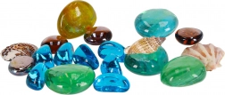 Im Block finden Sie glatte, glänzende Steinchen in Blau-, Grün- und Bernsteintönen sowie kleine Muscheln. Jedes Stück ist ein Unikat.