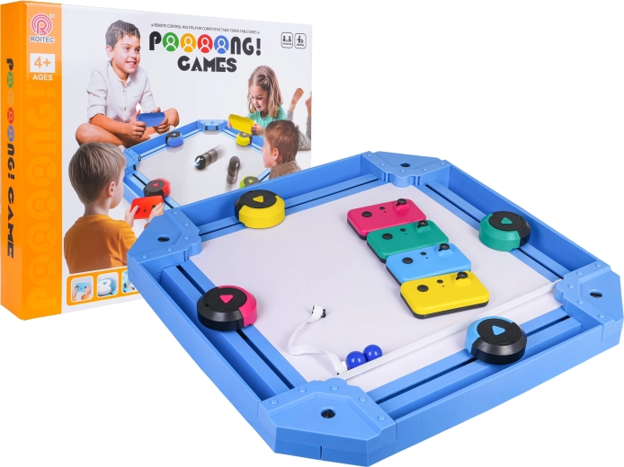 Das dynamische, ferngesteuerte Tischspiel für Kinder ab 4 Jahren bietet actionreichen Spaß für 2–4 Spieler. Mit den Controllern steuerst du die farbigen „Paddel“, greifst das Tor des Gegners an und verteidigst dein eigenes. Das Spiel fördert schnelle Reflexe, logisches Denken und ist ideal für Familienabende und Kinderpartys. Inklusive wiederaufladbarer Akkus für die Spielelemente, stabiler Spielarena und umfangreichem Zubehör.