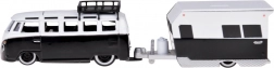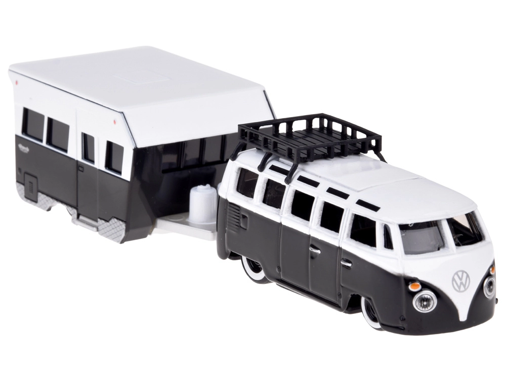 Das Set kombiniert den ikonischen VOLKSWAGEN‑Kleinbus mit einem detaillierten Camping‑Anhänger. Ideal für die Sammlung und fantasievolles Spielen.