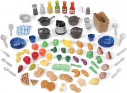Tassen, Teller, Pfannen, Lebensmittel und Utensilien – alles, was Kinder für kreatives Kochen und Servieren brauchen.