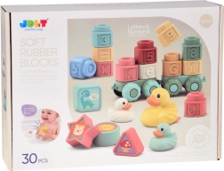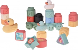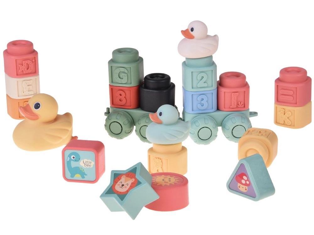 Dank der geprägten Motive von Buchstaben, Zahlen, Tieren und Formen entdecken Kinder spielerisch erste Begriffe, erweitern ihren Wortschatz sowie pränumerische Fähigkeiten. Das Set ist auch für Badewanne oder Pool geeignet – die Teile schwimmen, die Entchen bereiten bei jedem Bad Freude und die Bauelemente lassen sich auch außerhalb des Wassers stapeln.