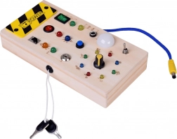 Dieses sorgfältig verarbeitete Aktivbrett aus Holz bietet eine Vielzahl an Reizen: vom Umschalten der Schalter über das Drücken von Tasten bis hin zum Drehen eines Reglers und dem Anschließen eines Kabels. Bei jeder Aktion sieht das Kind eine unmittelbare Reaktion in Form von Licht – das unterstützt Lernen und Konzentration auf natürliche Weise. Dank der kompakten Größe ist es ein idealer Begleiter für unterwegs – im Auto, Flugzeug, Zug, Restaurant oder Wartezimmer.