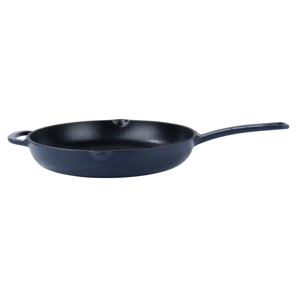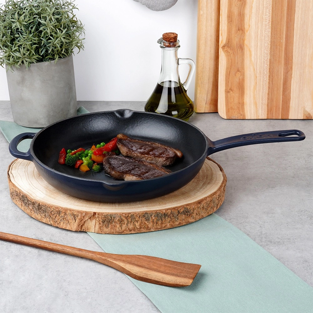 Diese runde emaillierte Gusseisenpfanne mit 26 cm ist ideal zum Braten, Anbraten, Backen und Überbacken. Massives Gusseisen erhitzt sich gleichmäßig und hält die hohe Temperatur über lange Zeit, wodurch Fleisch, Gemüse und Kartoffeln perfekt gegart werden. Die außen granatblaue Emaille verleiht der Pfanne ein elegantes Aussehen und erleichtert die Pflege.
