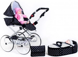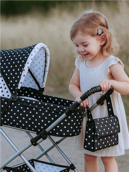 Eleganter Kinder-Retro-Puppenwagen NEW BABY Natálka im weiß‑schwarzen Punktedesign begeistert alle kleinen Fürsorgerinnen. Die stabile Metallkonstruktion mit Federung und leichten Gummirädern sorgt für eine ruhige, komfortable Fahrt drinnen wie draußen. Der verstellbare Griff in 5 Stufen wächst mit dem Kind mit und das klappbare Verdeck schützt die Puppe vor der Sonne.